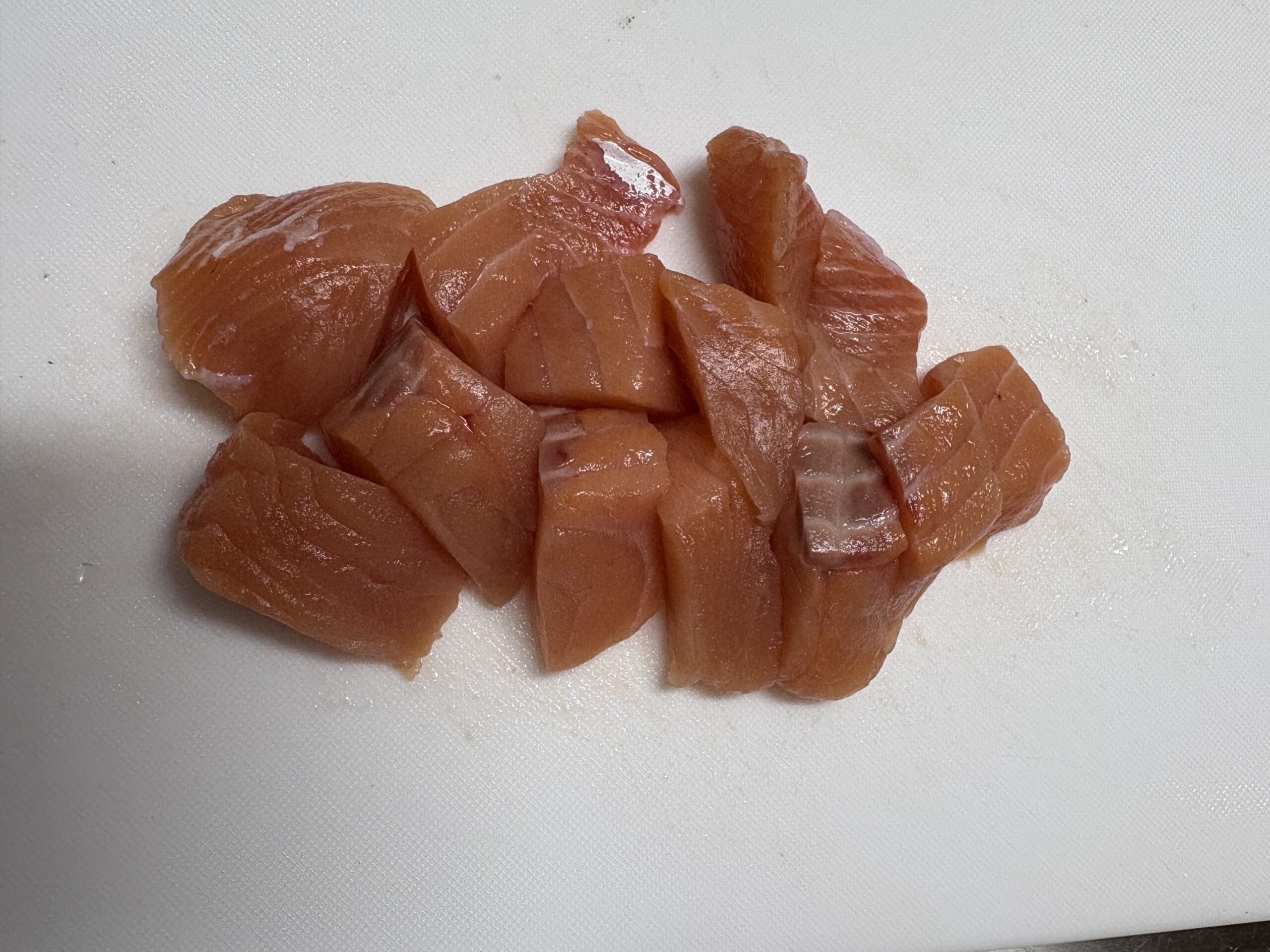 鮭切り身は骨があれば取り除き、一口サイズに四角く切りそろえます。