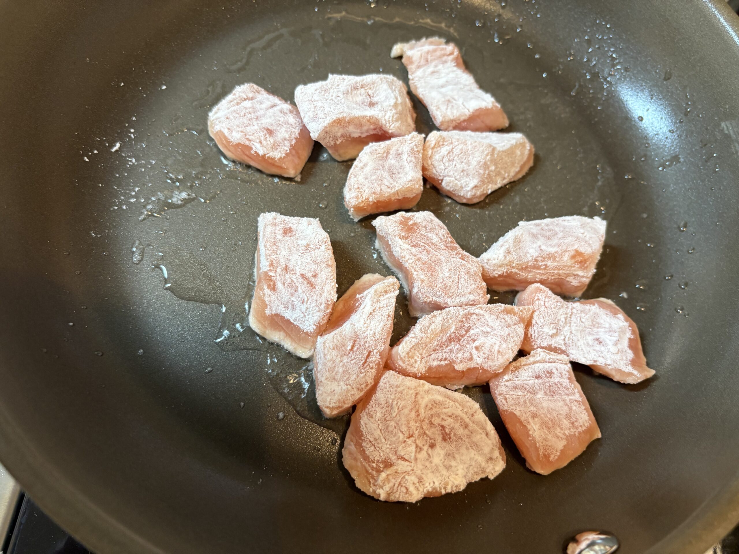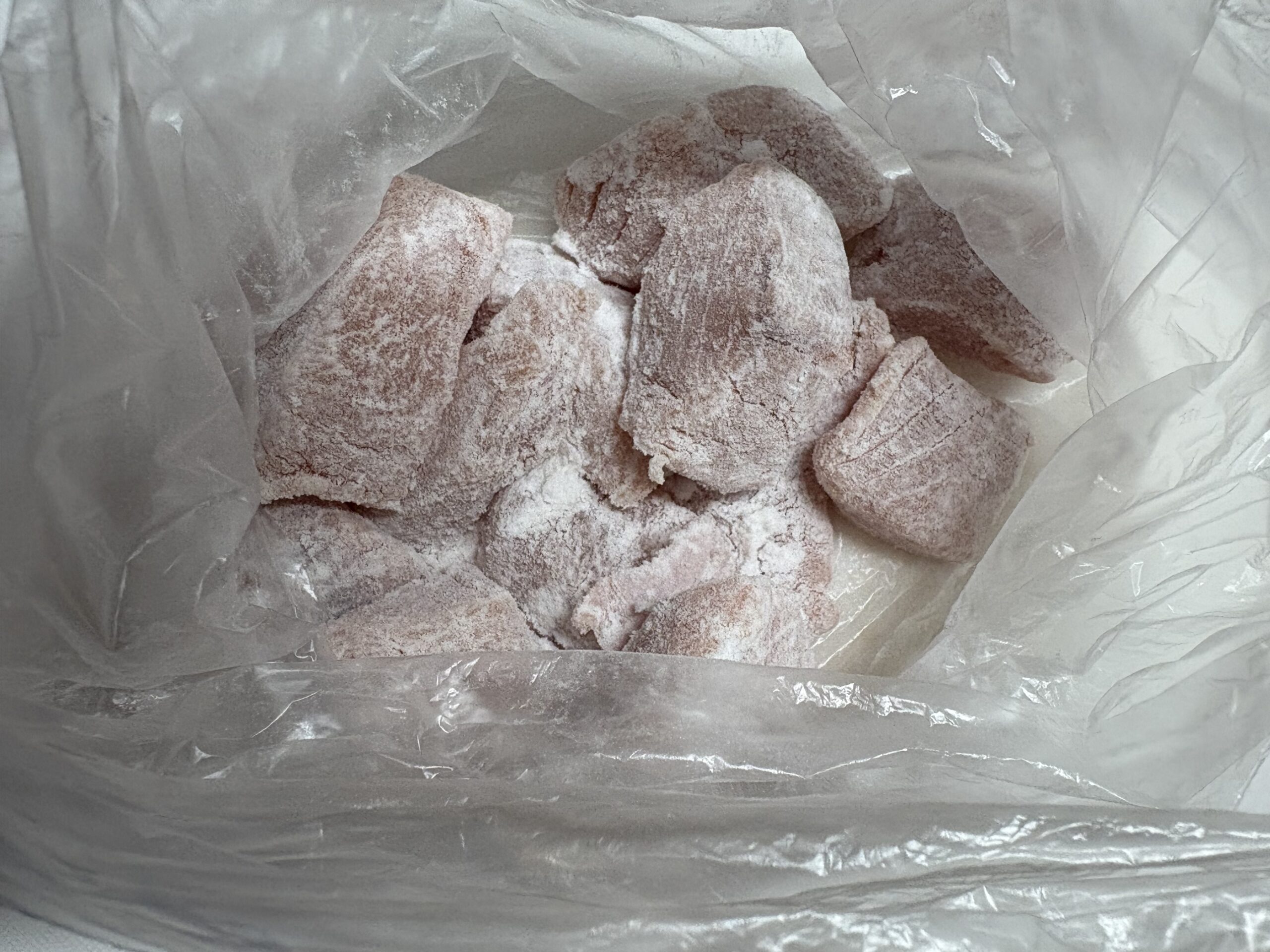 ポリ袋に分量の片栗粉と1の鮭を入れ、口を縛って振り、粉を全体によくまぶし付けます。
