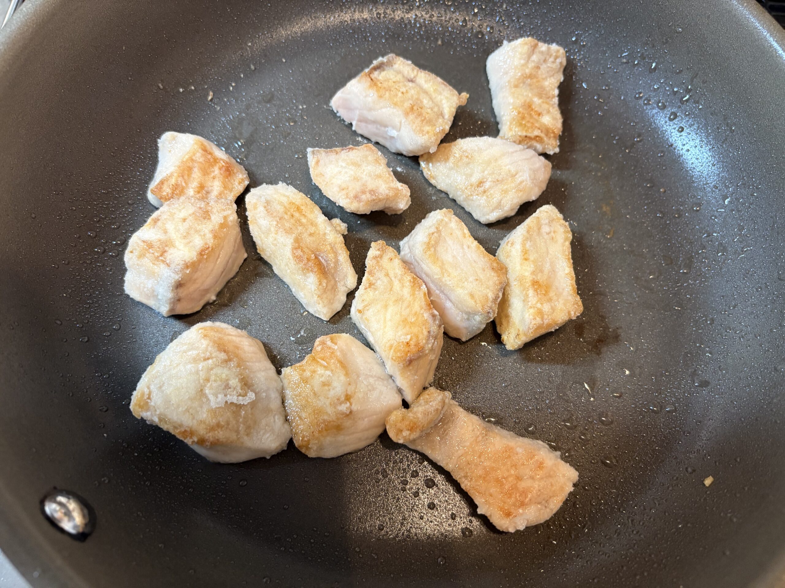 フライパンにちょっと多めのサラダ油(分量外)を熱し、2の鮭を焼いていきます。火加減は中火です。