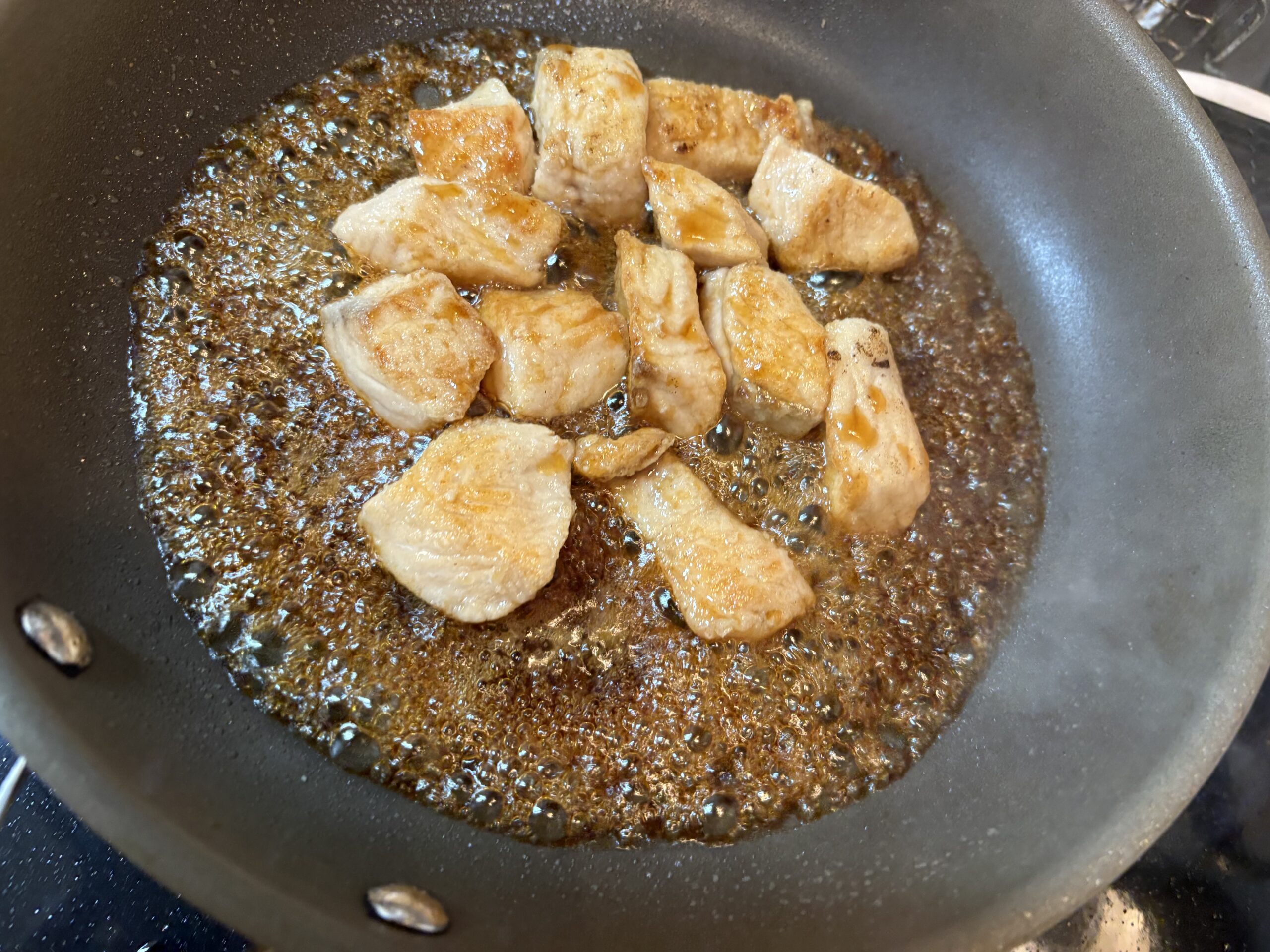 裏返したら少し火を弱め更に3分程度焼き、鮭に火が通ったら1の合わせ調味料を一気に流し入れます。フライパンを大きく動かし全体にしっかりとタレが絡んで照りが付いたら完成です。