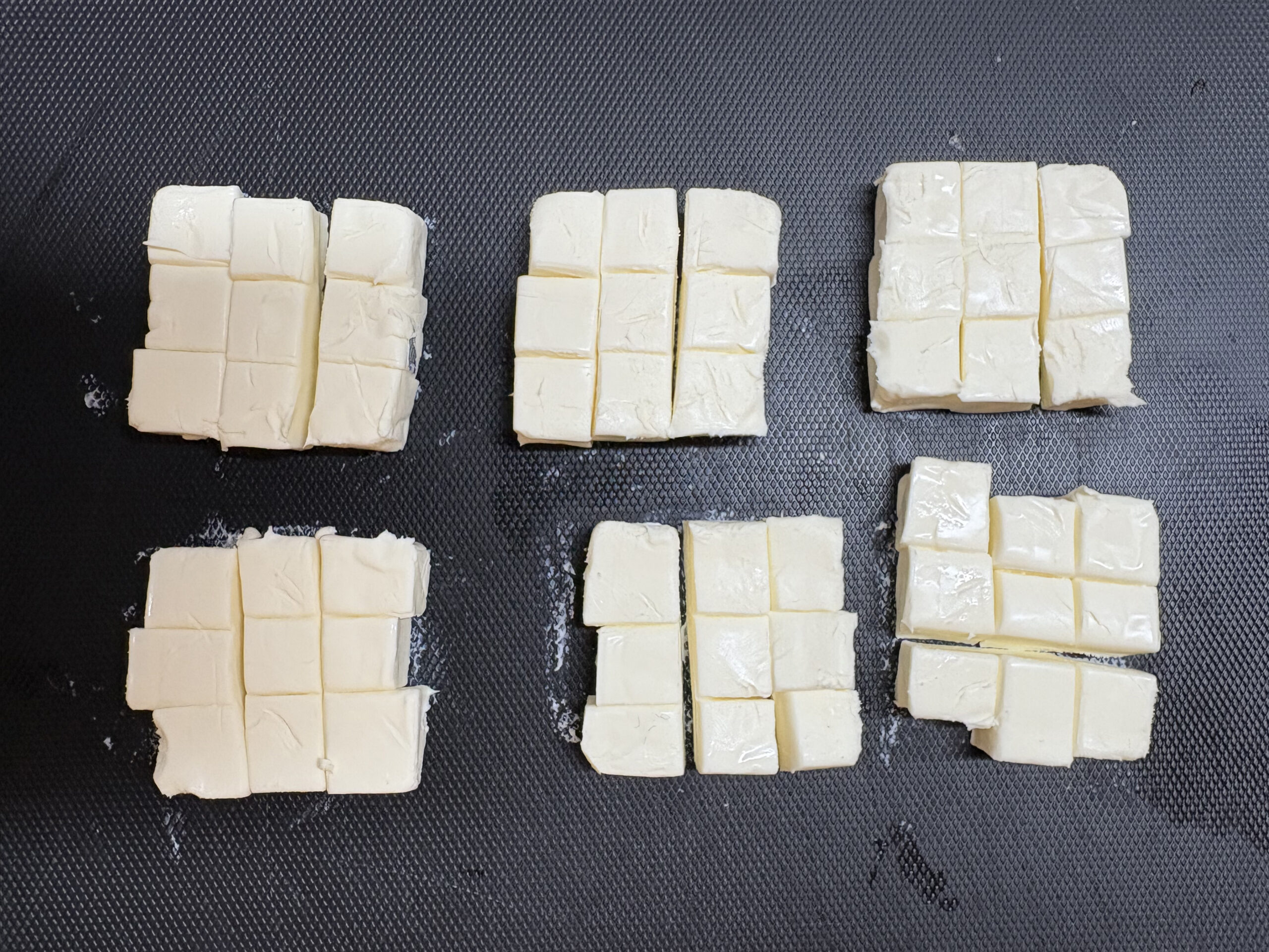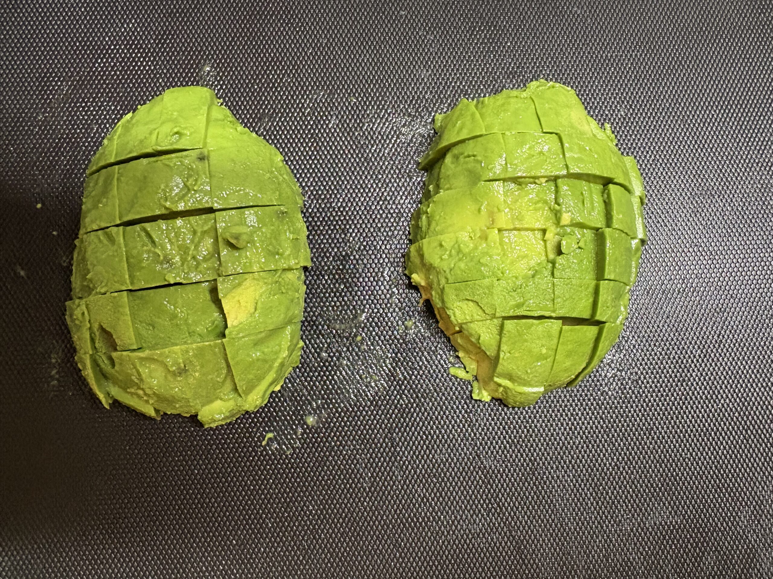 1のアボカドと用意したチーズをそれぞれ1センチ角くらいの同じ大きさになるように切りそろえます。