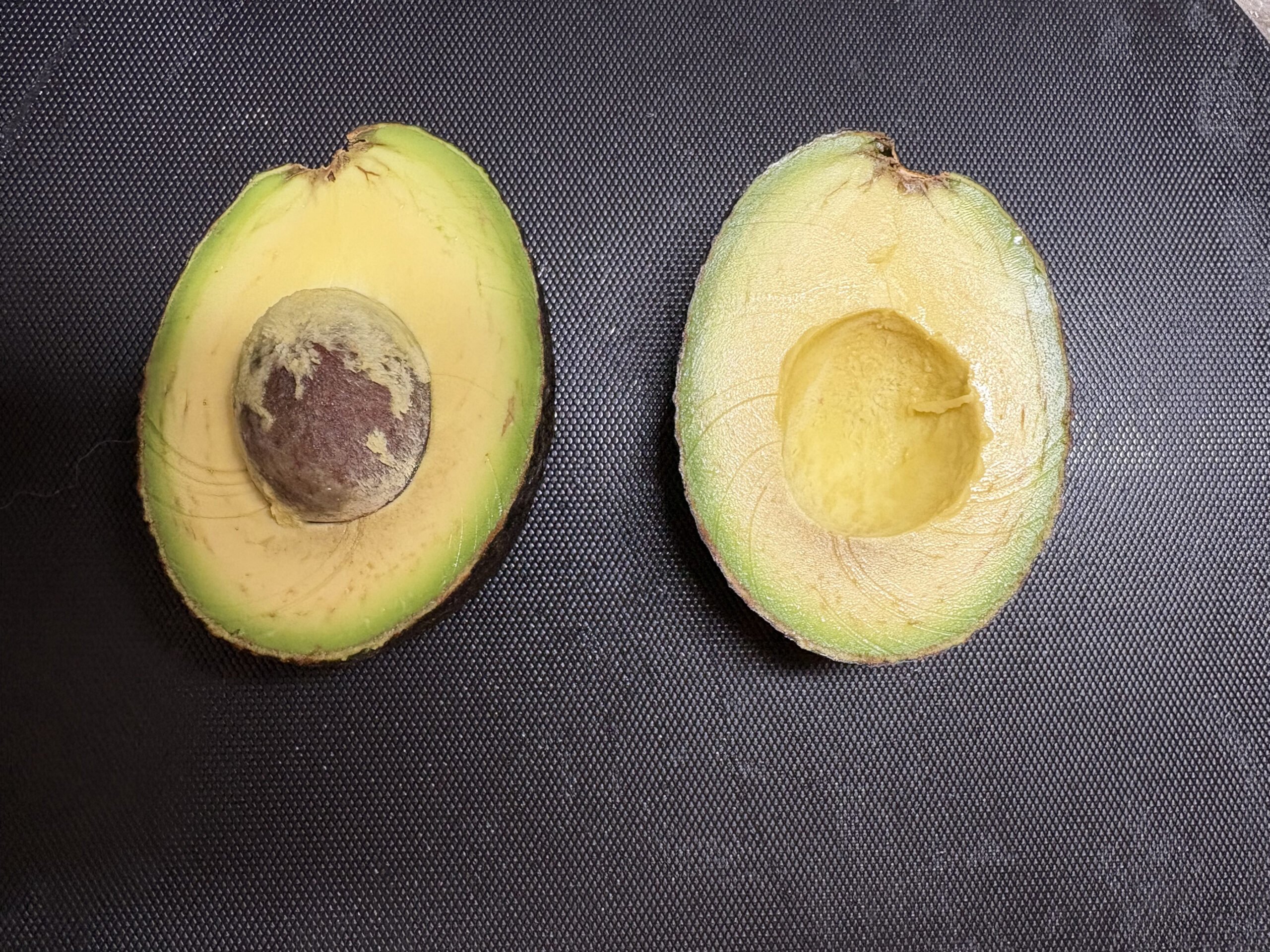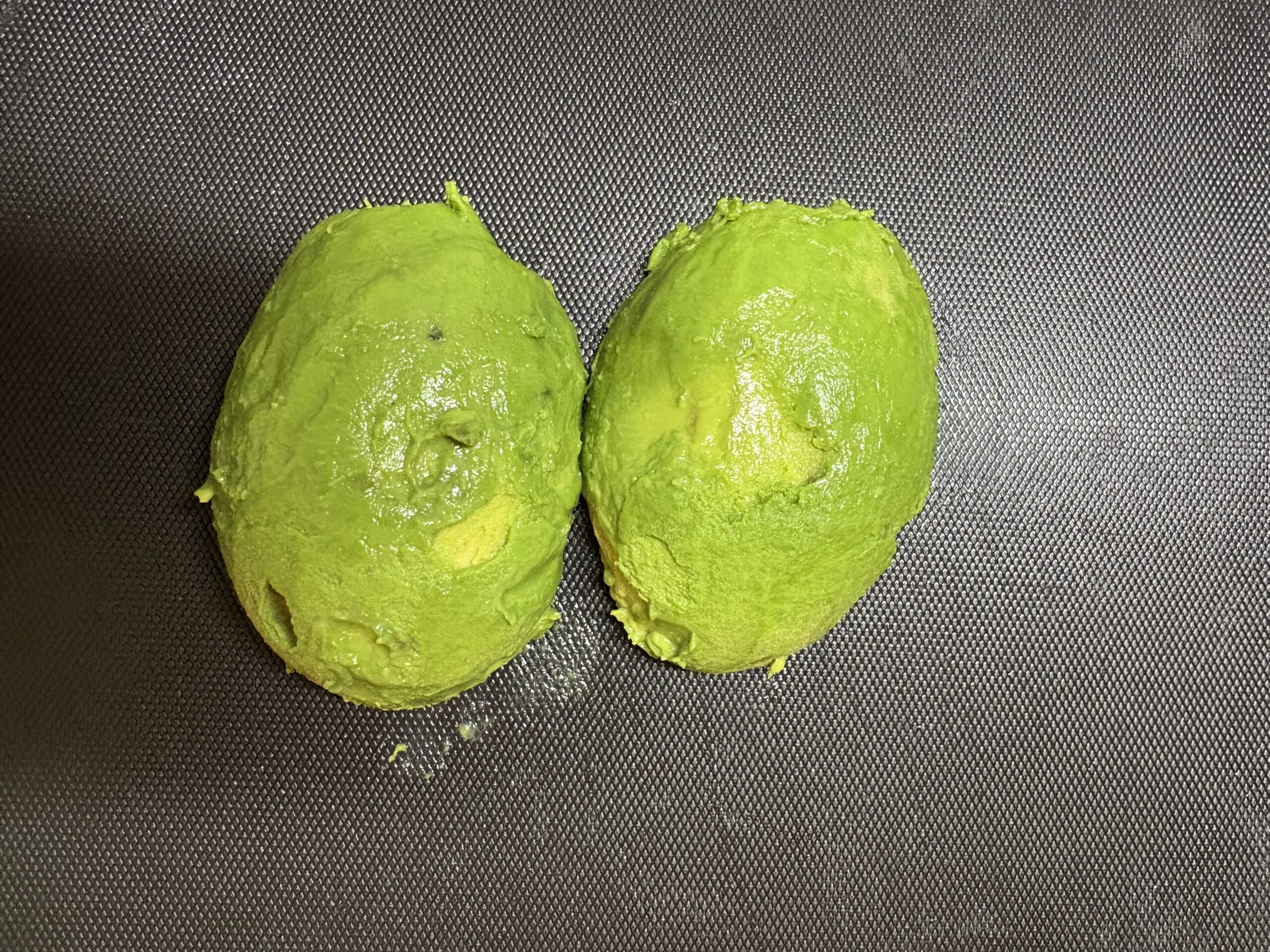 アボカドは種の周りにぐるりと包丁を入れて半分に割り種を取り除いたら皮を剥きます。