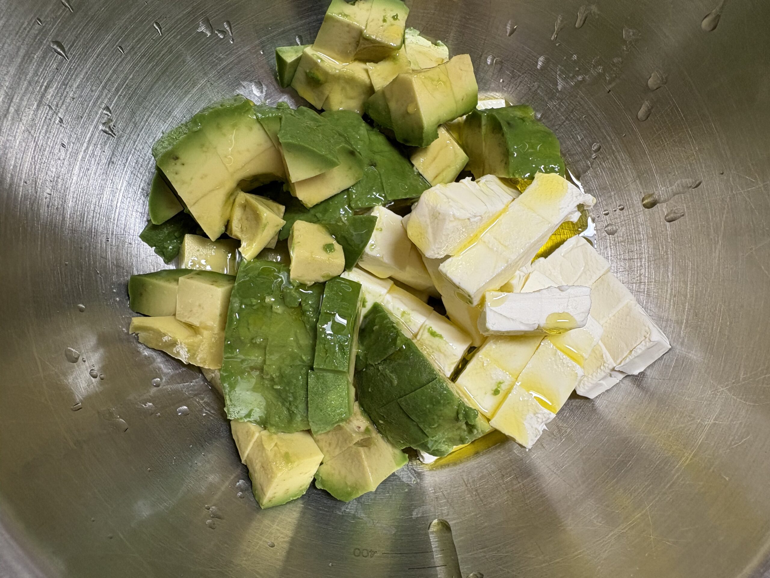 2のアボカドとチーズをボウルに移し、オリーブオイルとレモン汁をかけて和えたら完成です。チーズに塩分がありますが、足りないようなら軽く塩か醤油を振ってもかまいません。この辺りはお好みで。器に盛り付けたらお好みで黒胡椒を振り掛けて召し上がれ。
