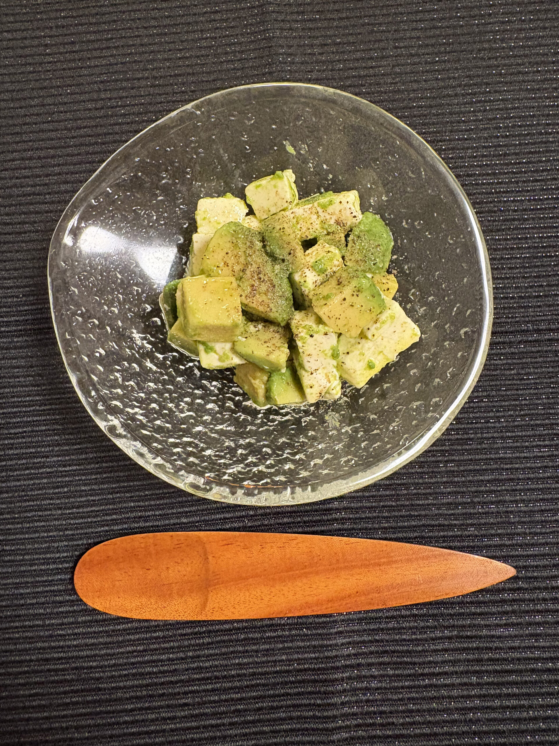 今回ご紹介するのは、アボカドとチーズをオリーブオイルで和えた料理とも言えないものですが、ちょっとしたテーブルの賑わいにもなりますし色々な種類のお酒によく合います。胡椒が嫌いで無ければ黒胡椒をたっぷりと振り掛ければ味にアクセントも付いて更にお酒が進みます。そのままバケットなどのパンにのせて食べても美味しいですので、チーズとアボカドがあれば一度試してみて下さい。使うチーズは今回クリームチーズを使いましたが、これはお好みのチーズ何でも良いと思いますが、お年寄りがいらっしゃる場合には硬いタイプのチーズは避けた方が良いかもしれませんね。色々にお試し下さい。
