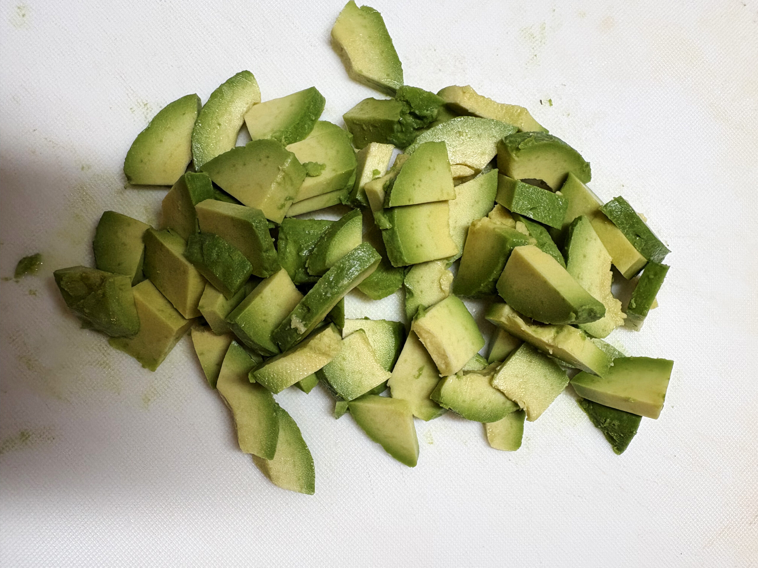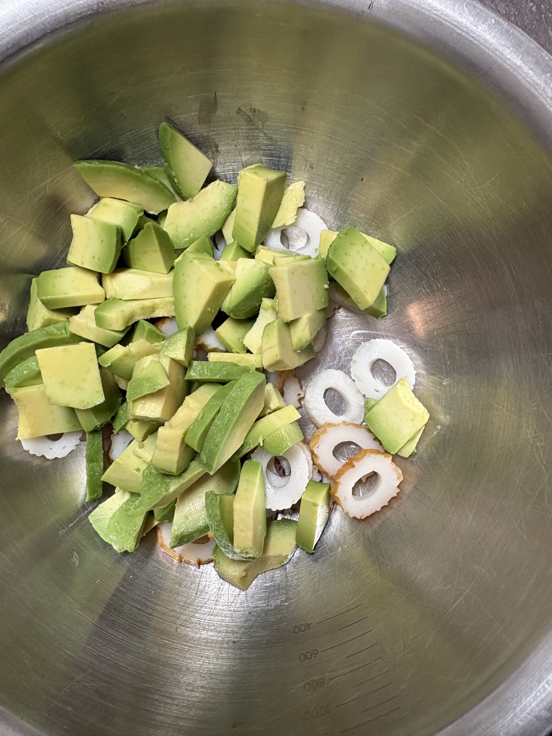 アボカドは海苔と相性が良いですので、あれば刻み海苔やもみ海苔などを盛り付ける時に天盛りすると味にアクセントが付いて美味しいと思います。嚥下の悪いお年寄りに提供する場合も、アボカドが口の中で食べ物をまとめてくれるのでトロミ液などを使わなくてもそのまま食べて頂けると思います。トロミ調整剤はとても便利ではありますが、料理の食感を悪くしますので工夫してなるべく使わないように心がけましょう。