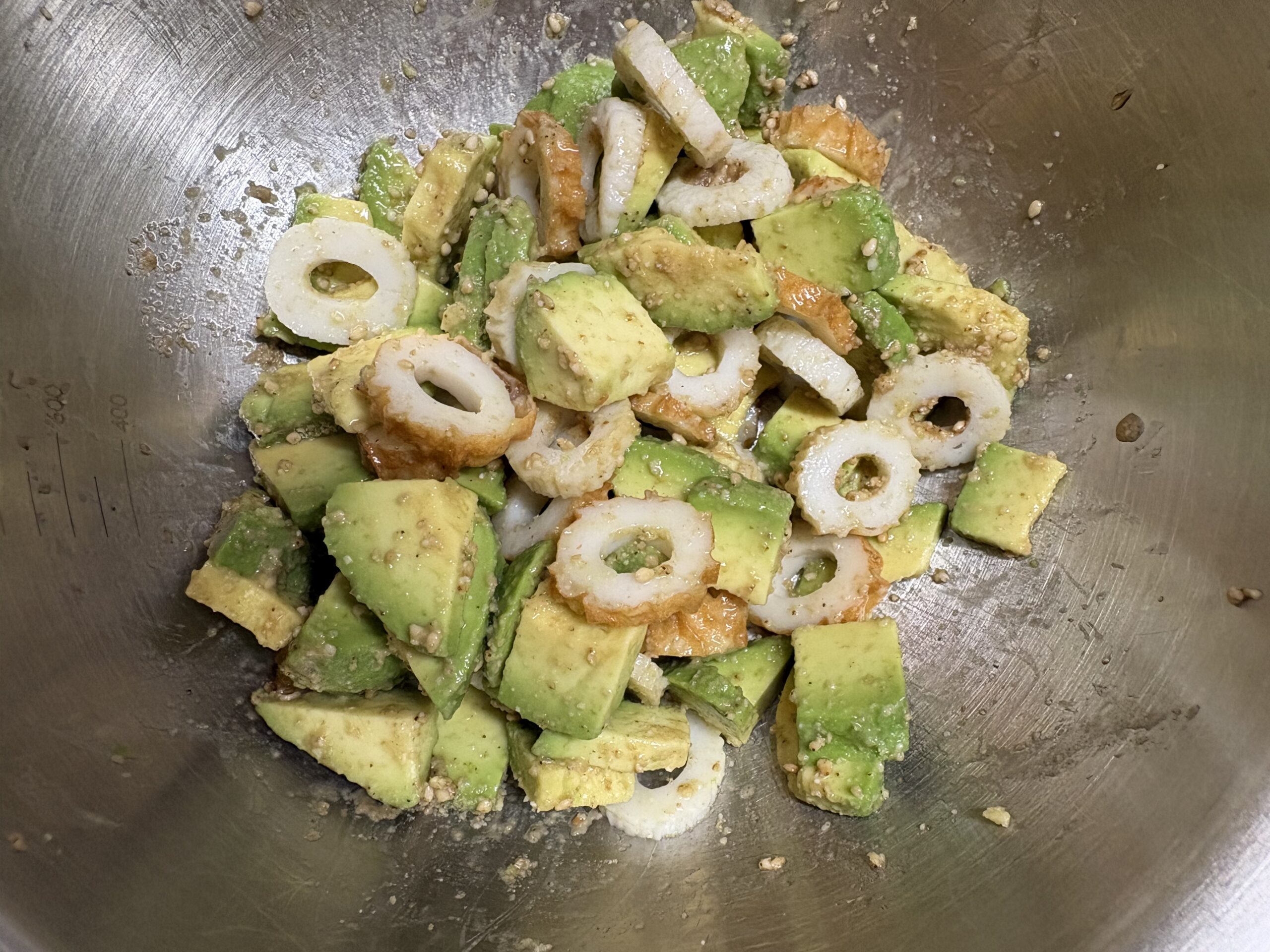 | 2 | 1のチクワとアボカドをボウルに入れ、分量のすりゴマとめんつゆで和えたら完成です。 |