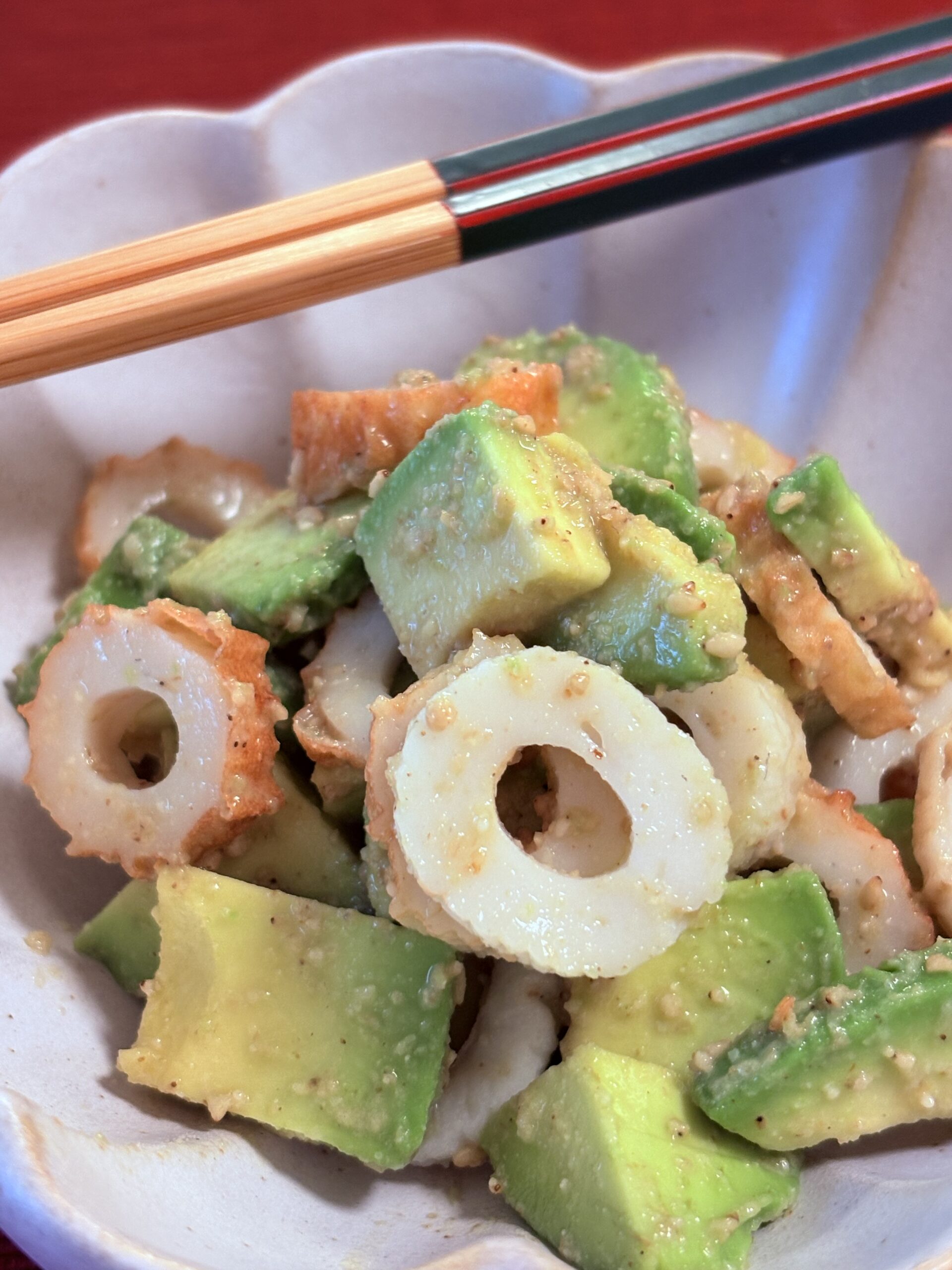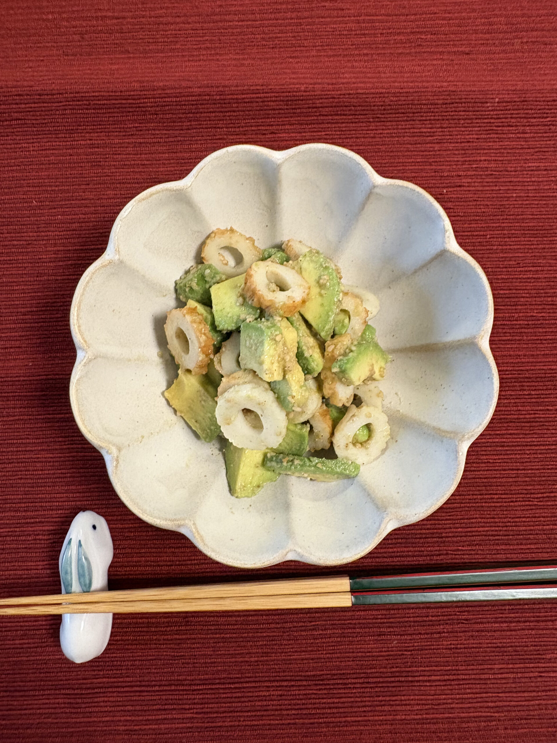 栄養価の豊富なアボカドを、これまた栄養価の豊富な胡麻和えにします。味つけはめんつゆだけ。今回一緒にチクワも和えましたが、これは残り物のカマボコやカニカマ、ツナなどでも美味しく出来ると思います。アボカドもチクワも柔らかいですし、しっとりと仕上がりますので、お年寄りにも食べやすい和え物になります。火を使わないで10分で出来る一品です。