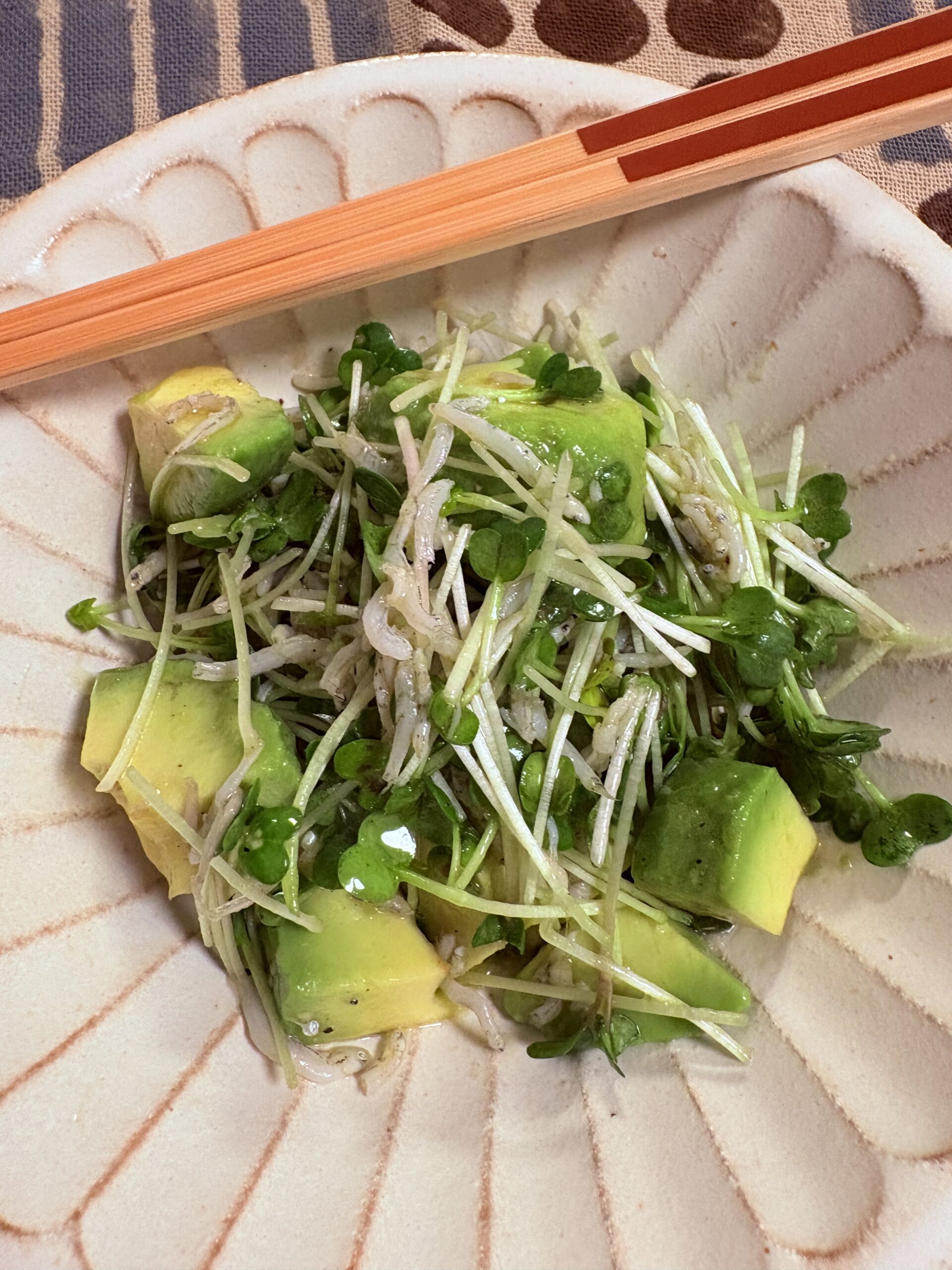 | 4 | 2のドレッシングでアボカド、貝割れ、分量のシラスを和えたら完成です。 |