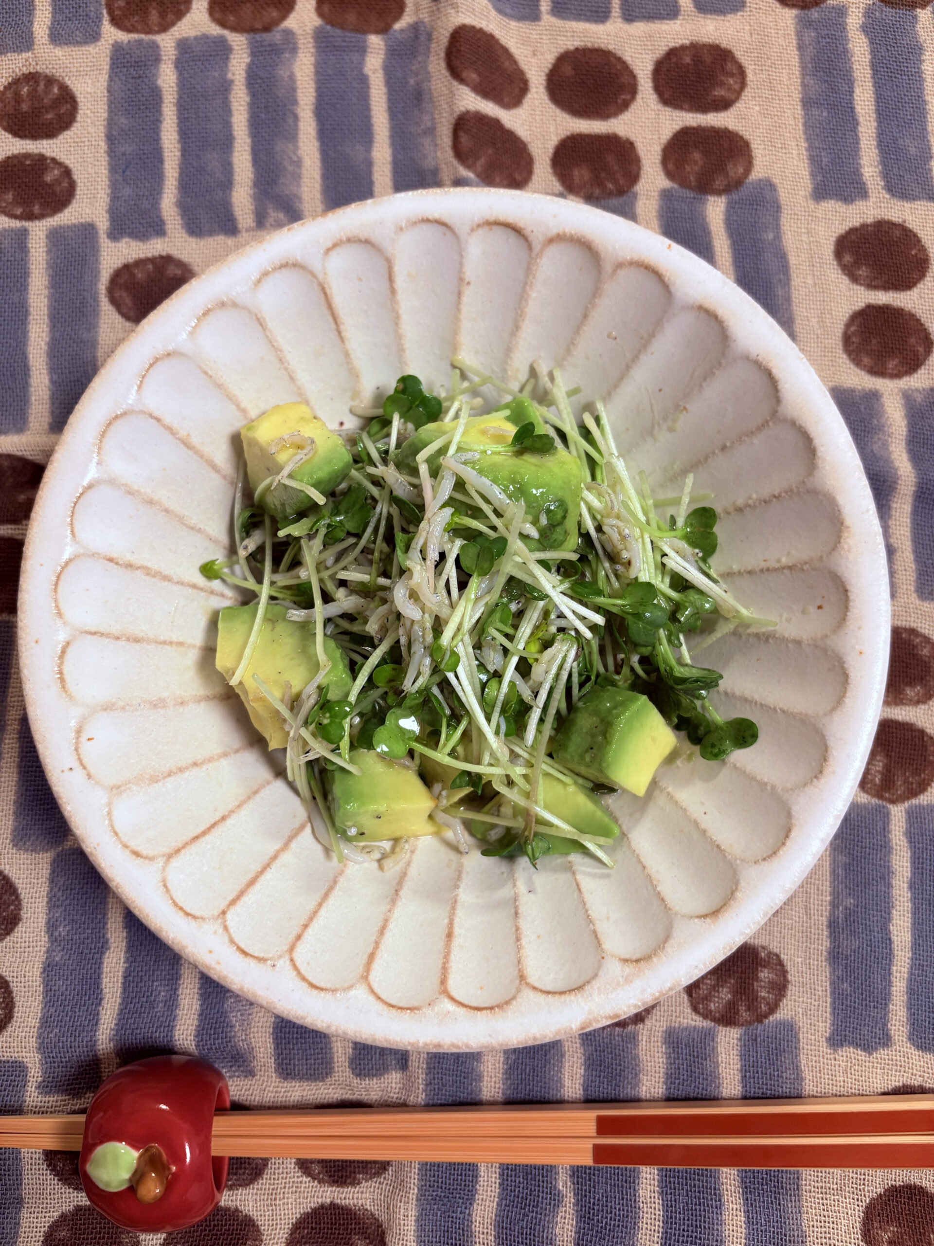 | 4 | 2のドレッシングでアボカド、貝割れ、分量のシラスを和えたら完成です。 |