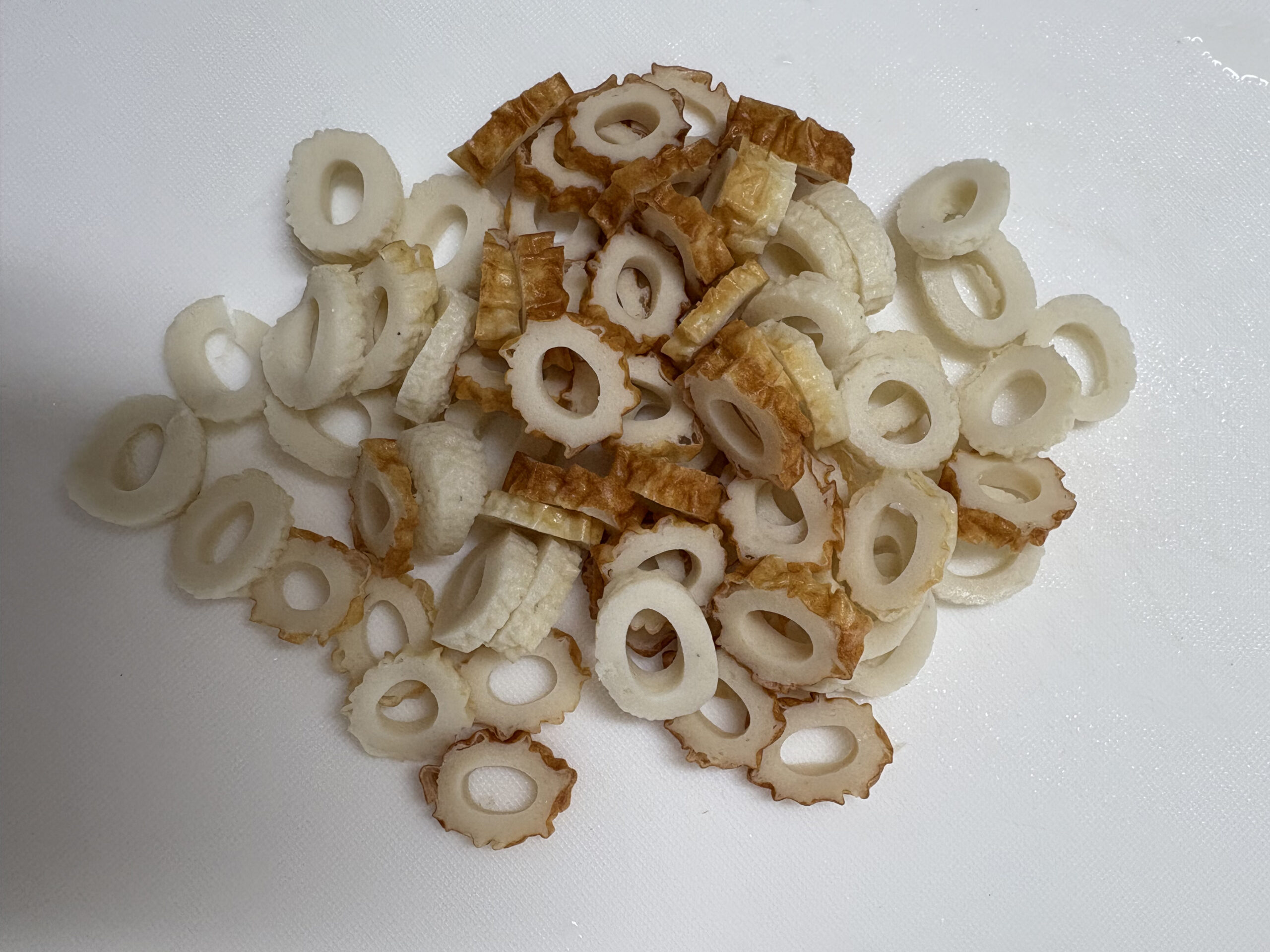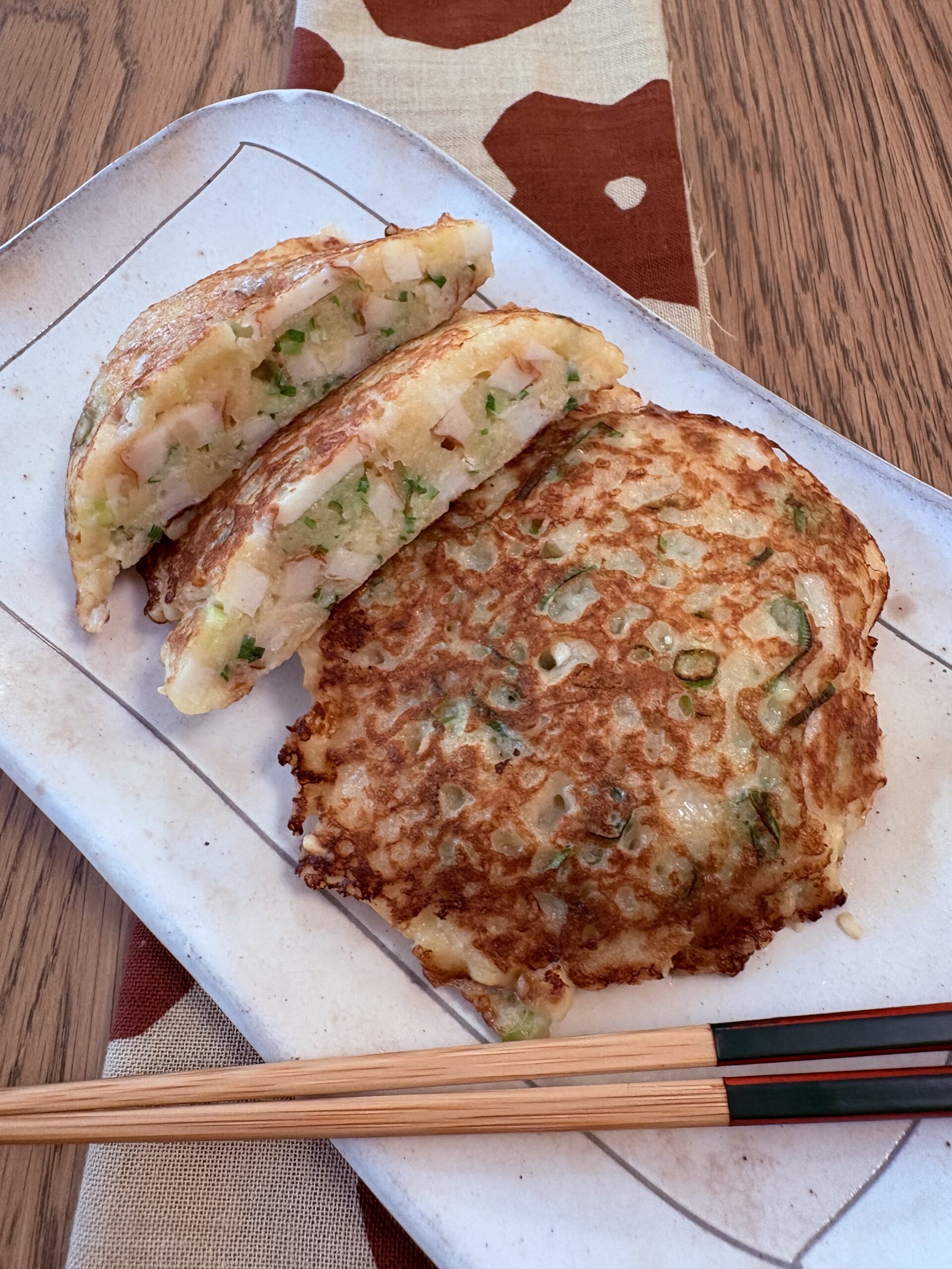 お焼きにしたチクワはとても柔らかいですので、歯の悪い方でも問題無く食べられると思います。香りと色目に刻んだ青ネギを入れましたが、これもお好みで大葉など他の野菜に変えても良いですしネギが好きな方でしたらもっとドッサリとネギを入れてネギ焼き風にしてもいいですね。色々にアレンジしてお楽しみ下さい。