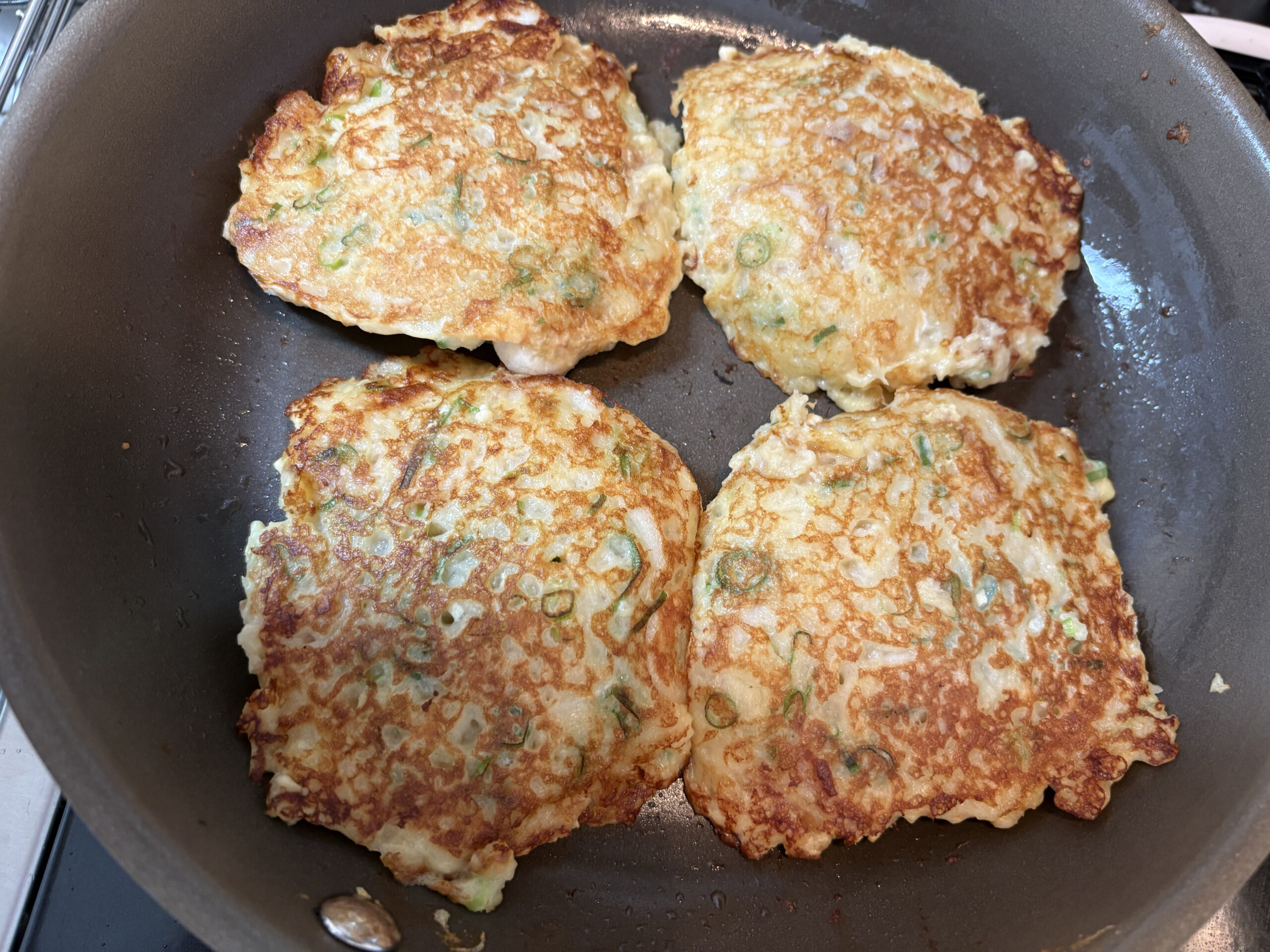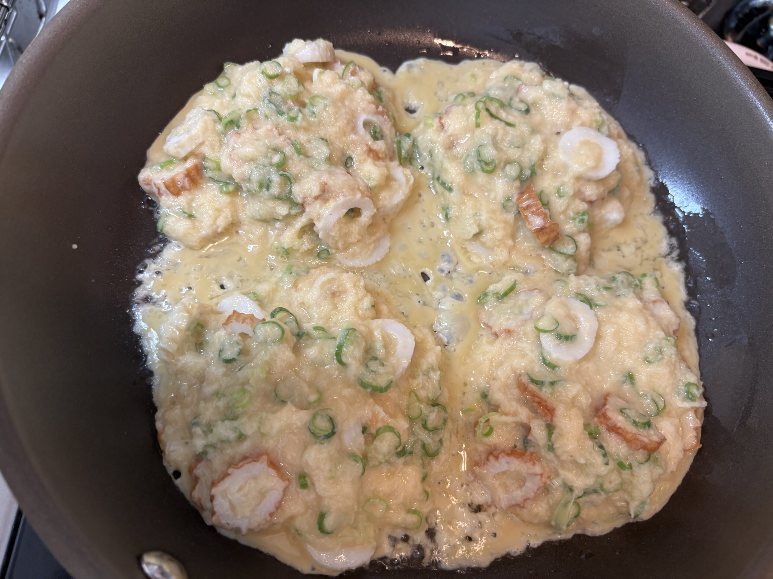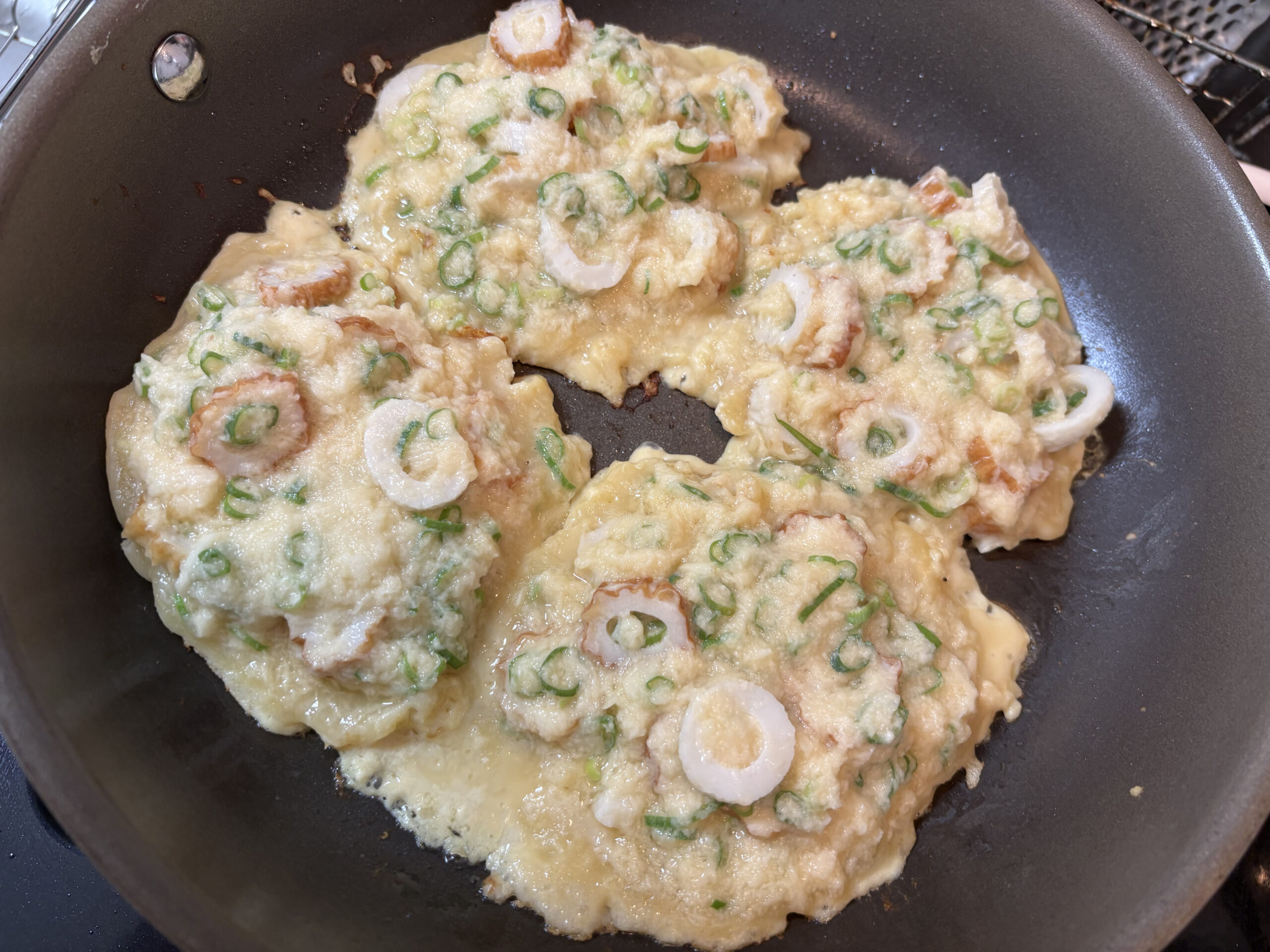 3 | フライパンを中火で熱し薄く油を引いたら、2の生地を4個くらいに分けて焼くイメージでフライパンに入れていきます。この時水分が流れて分けて入れた生地が引っ付いてしまいますが、気にせず生地を全部フライパンに入れてしまいましょう。 |
