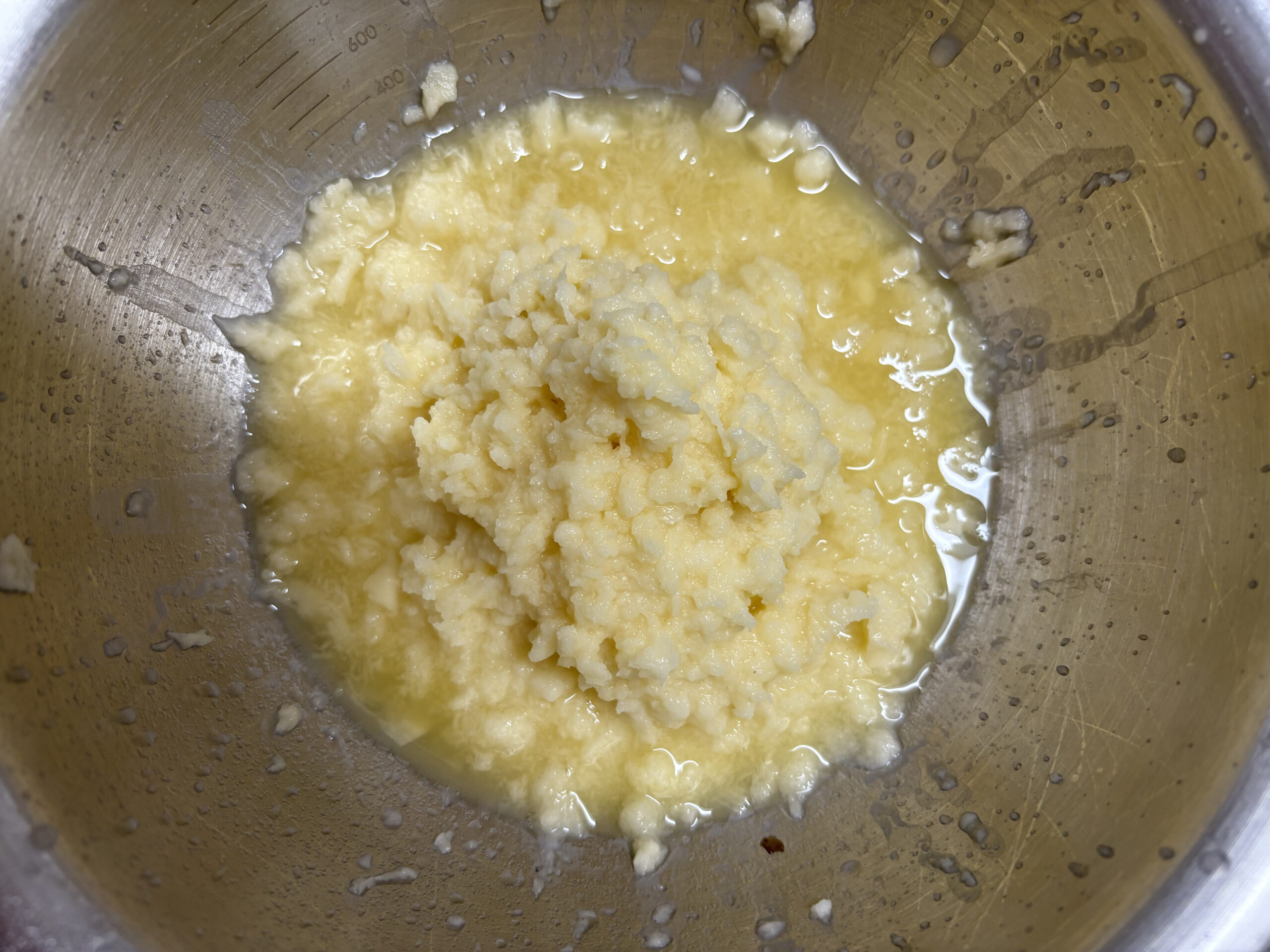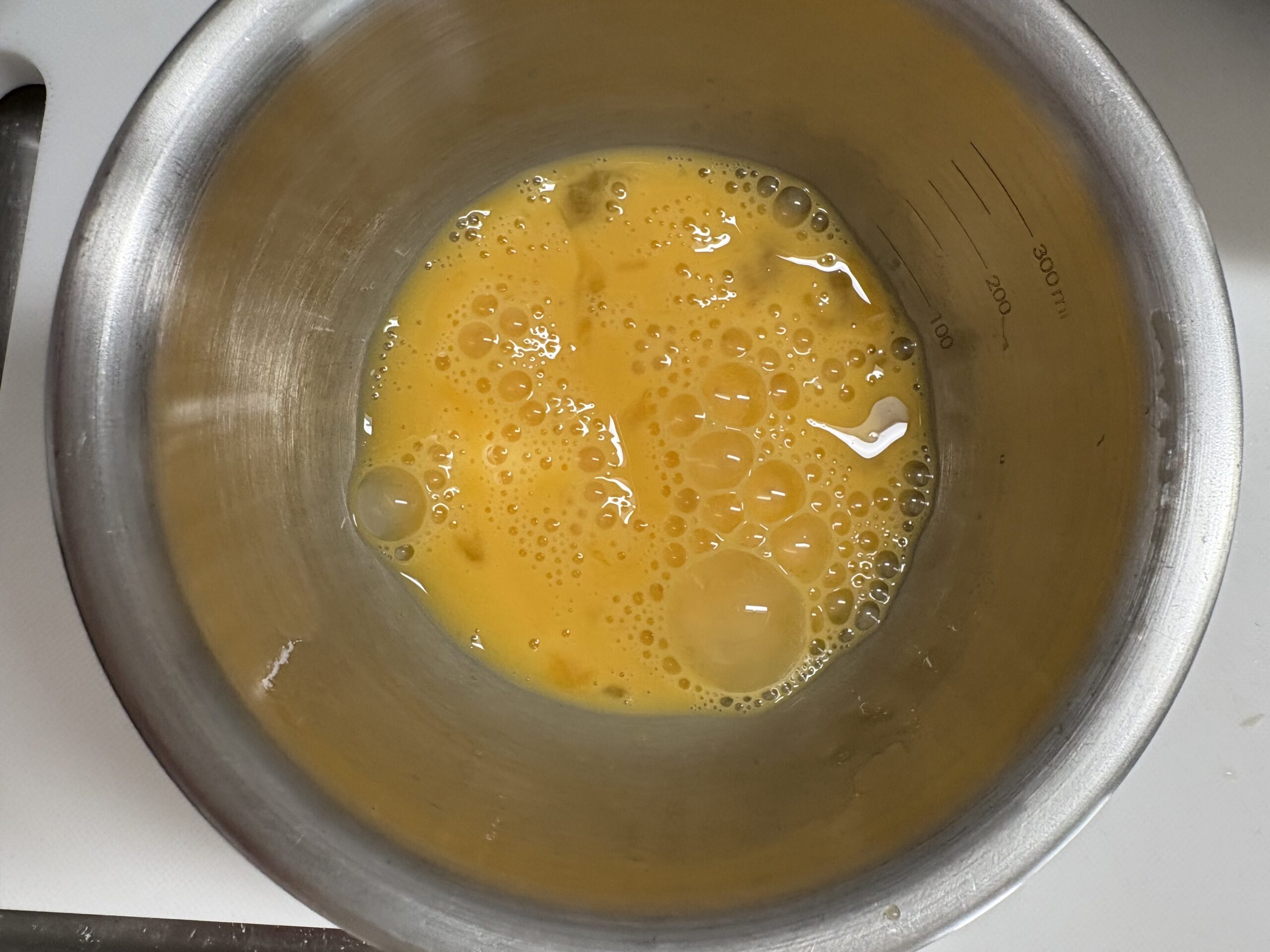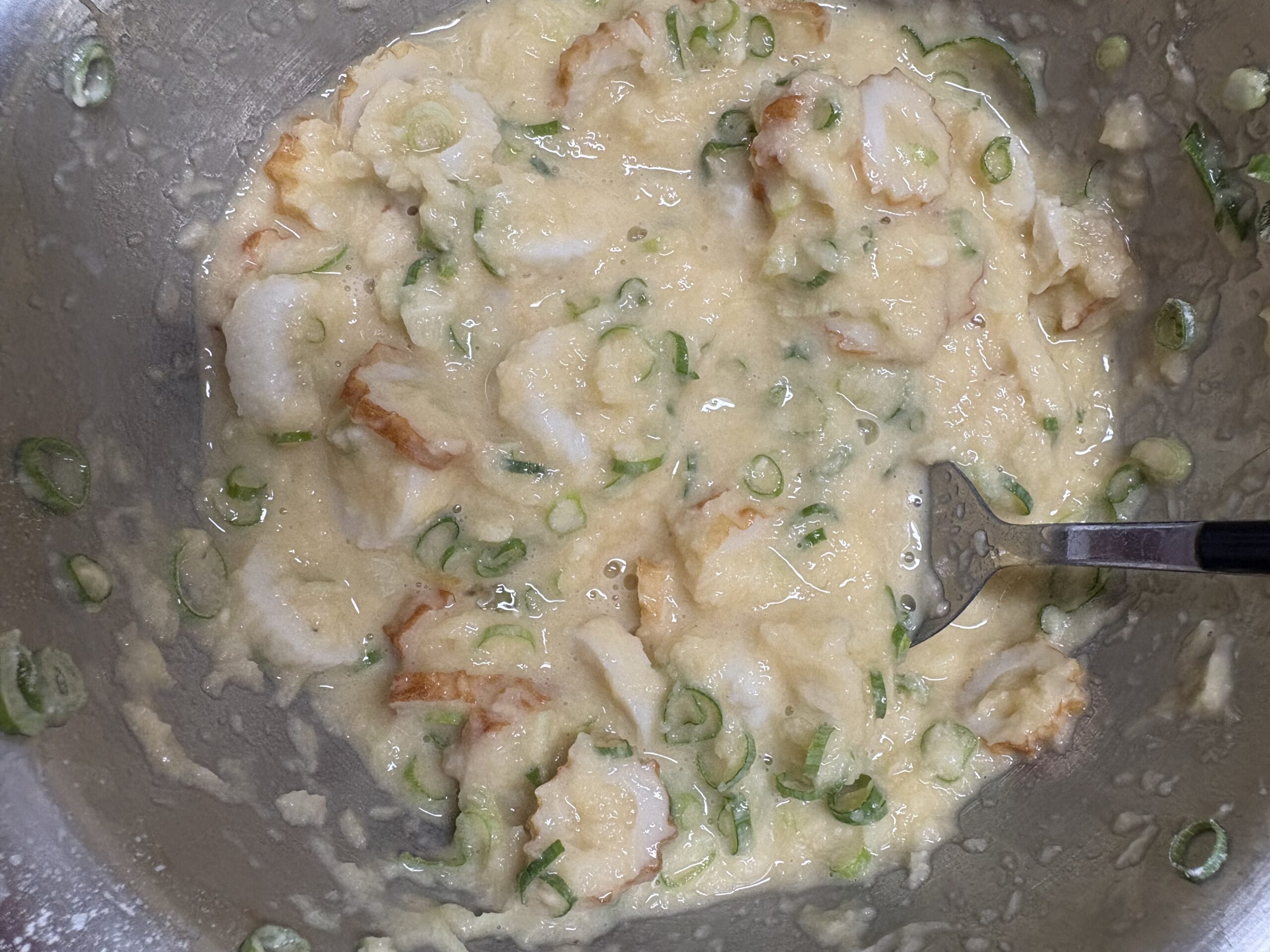 3 | フライパンを中火で熱し薄く油を引いたら、2の生地を4個くらいに分けて焼くイメージでフライパンに入れていきます。この時水分が流れて分けて入れた生地が引っ付いてしまいますが、気にせず生地を全部フライパンに入れてしまいましょう。 |