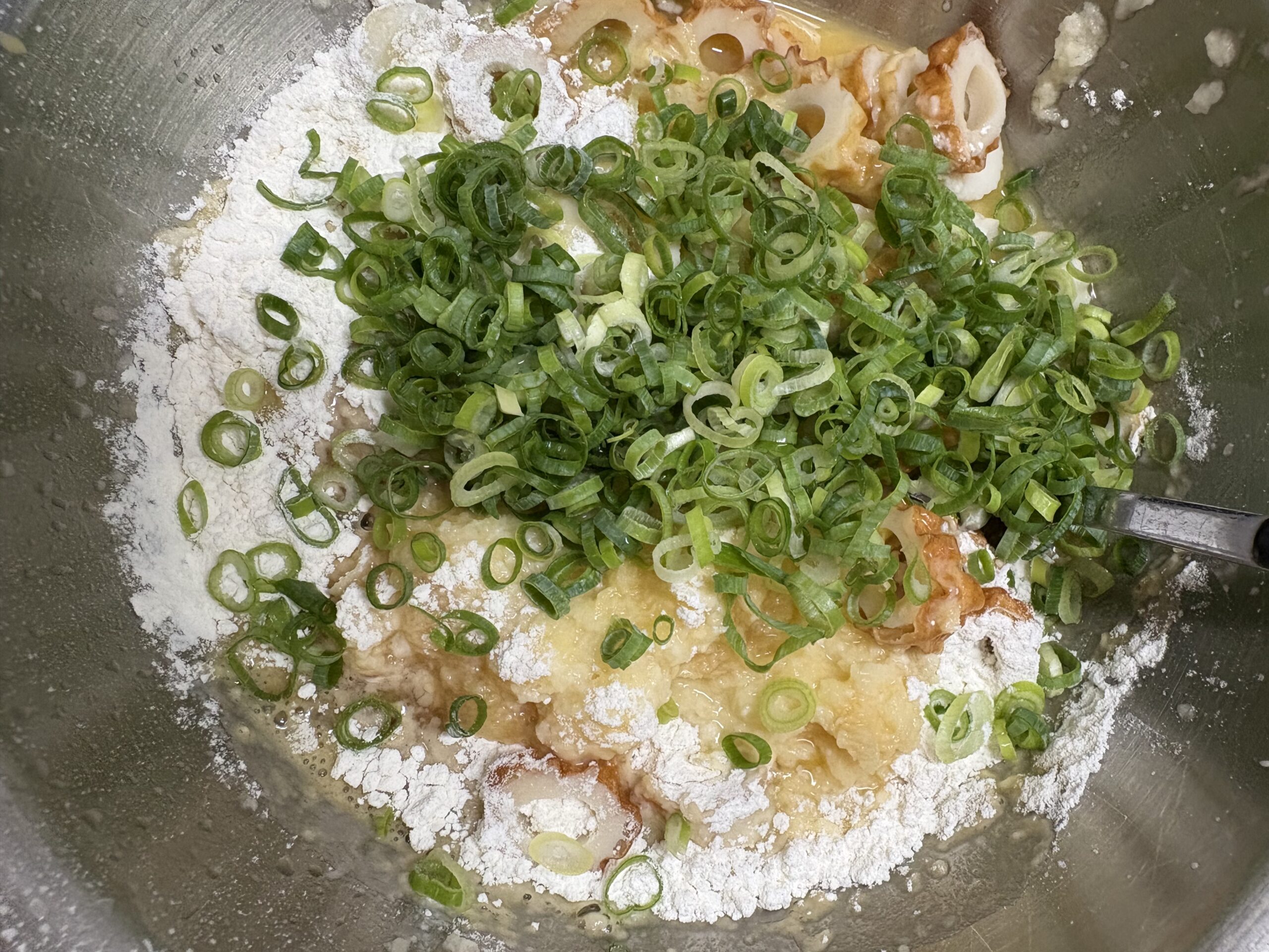 2 | ボウルに1のジャガイモ、チクワ、溶き卵、刻みネギを入れ、小麦粉とめんつゆを加えたら全体をよく混ぜ合わせて生地を作ります。 |
