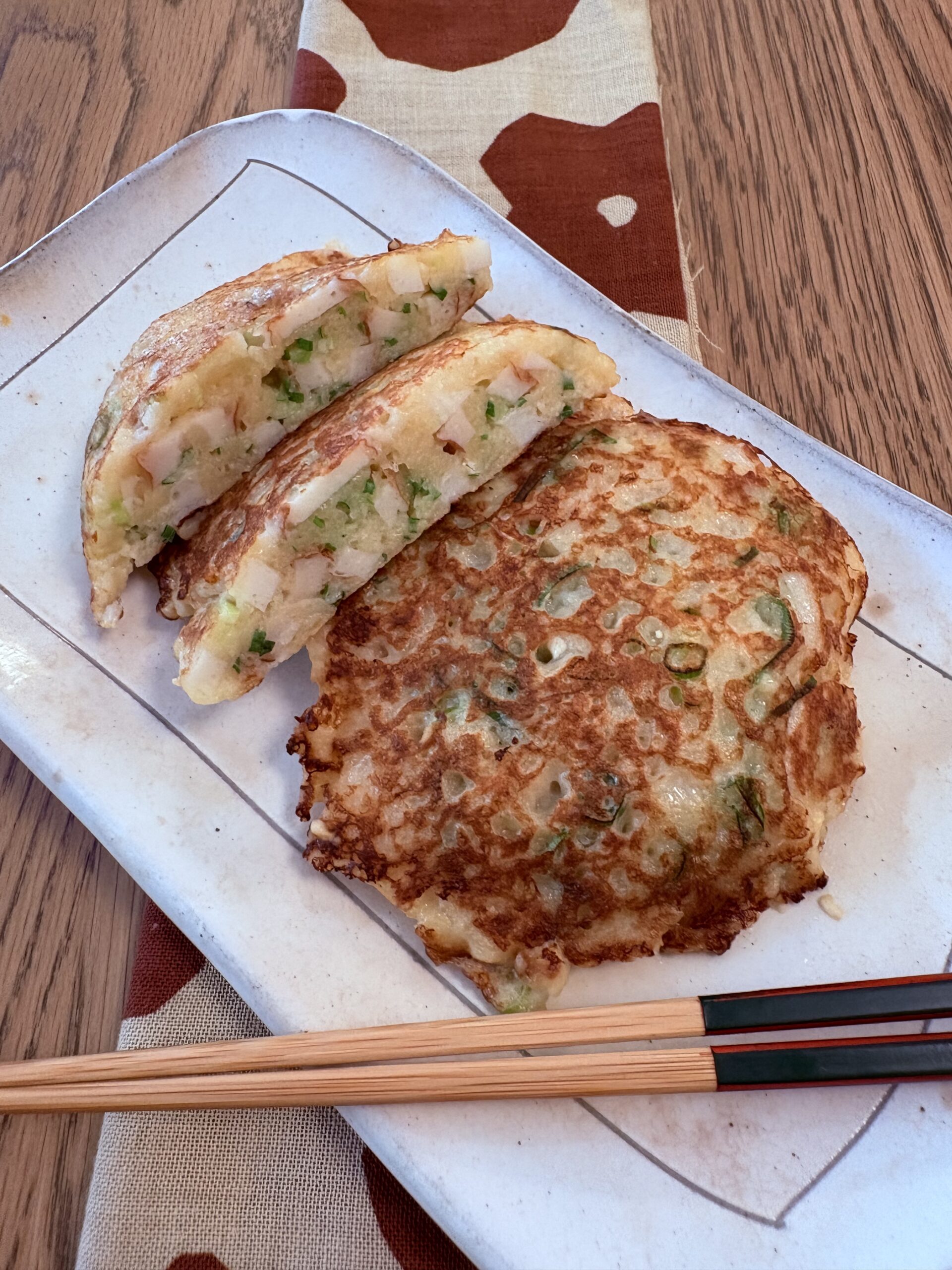 ジャガイモを摺り下ろしたものにチクワを刻んで加えお焼きにするレシピをご紹介します。めんつゆで薄味を付けて焼きますのでそのまま食べてもいいですし、お好みでソースやポン酢なども合うと思います。繋ぎに小麦粉を入れましたが、使わなくてもまとまると思いますのでこれはお好みで加えて下さい。モッチリとした食感のお焼きですので、嚥下の悪い方に提供する場合は、一度に沢山食べないように気をつけましょう。