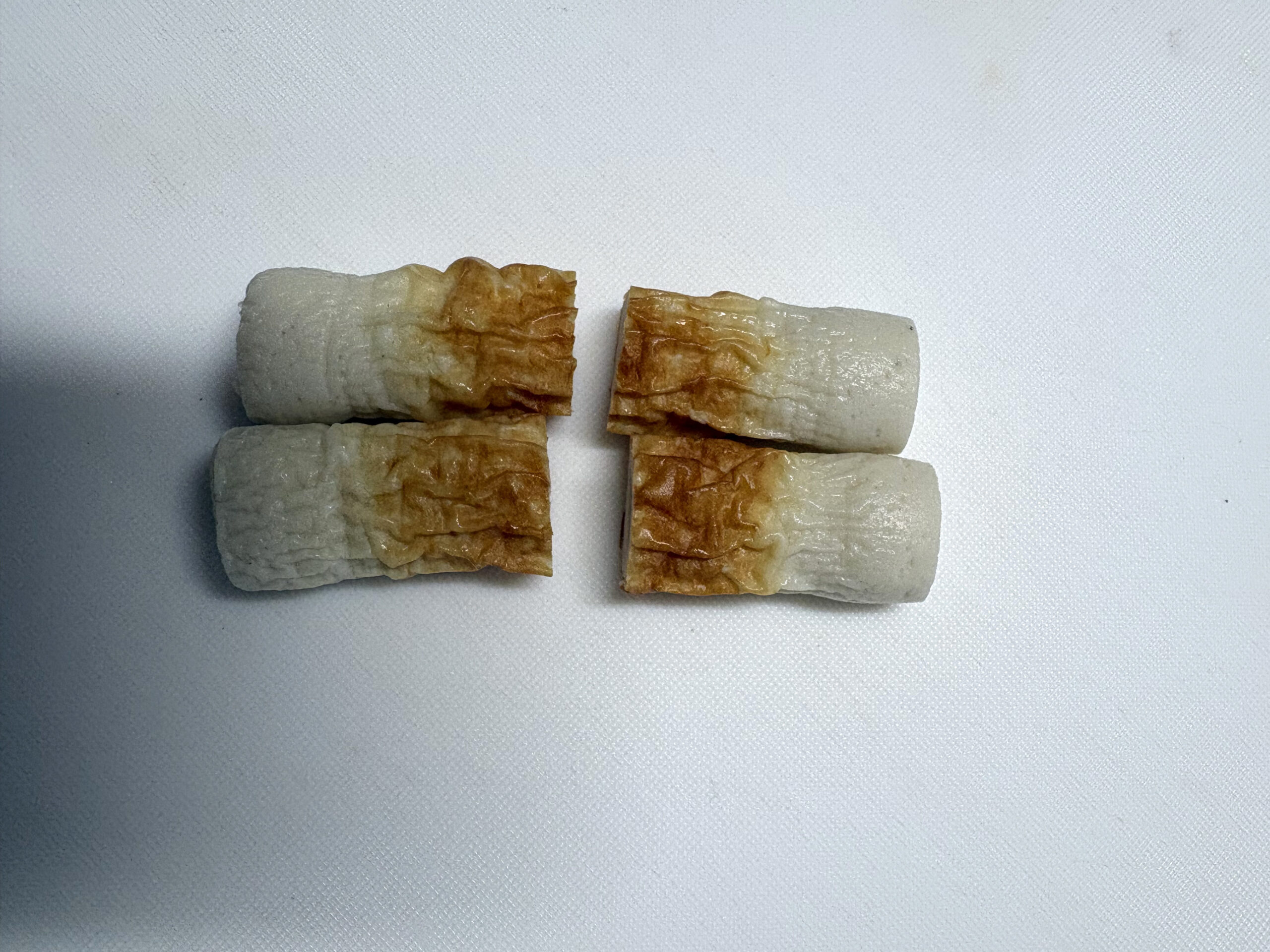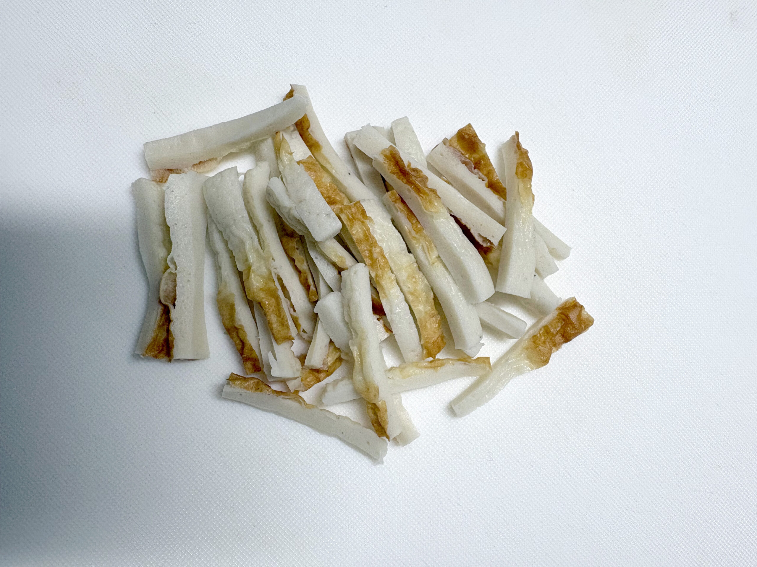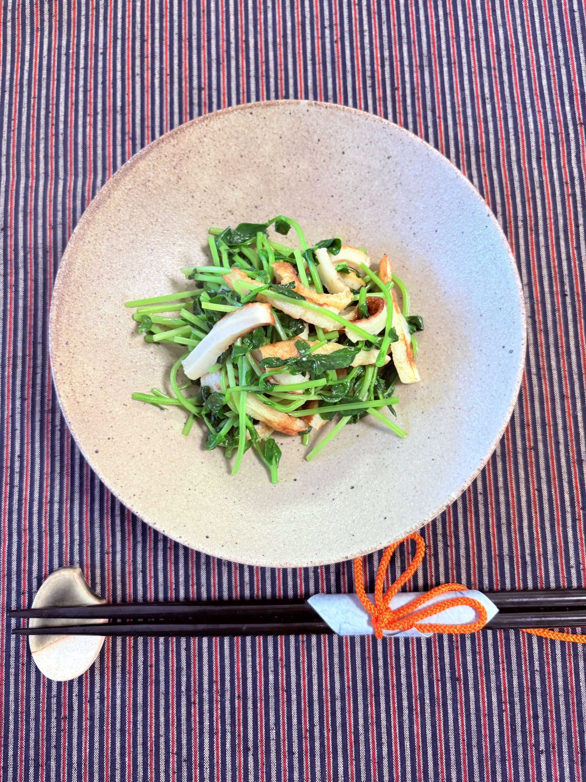 | 1 | 豆苗はサッと洗って根元を切り落とし、2等分に切ります。チクワは長さ5センチ程度の拍子切りにします。 |