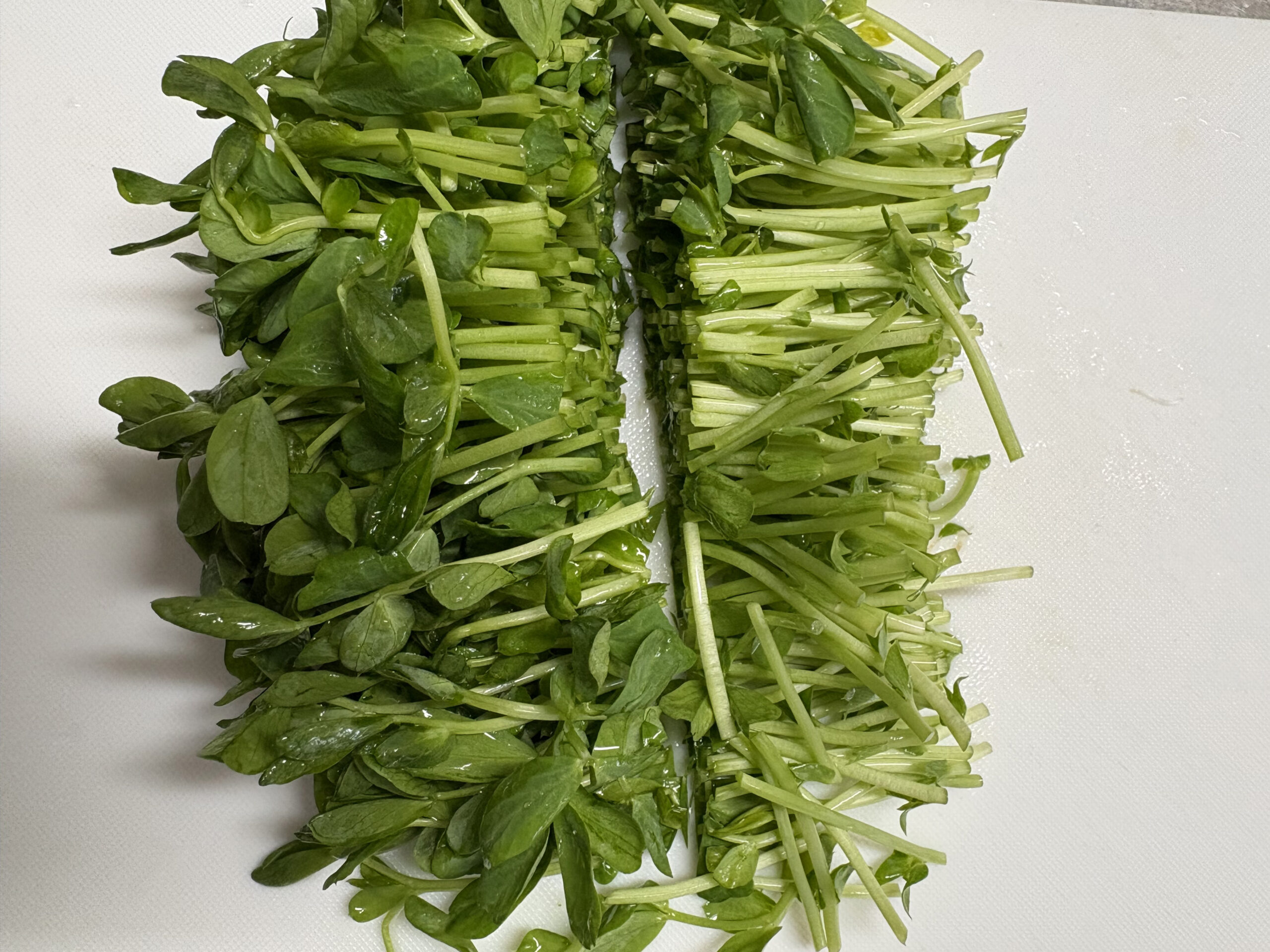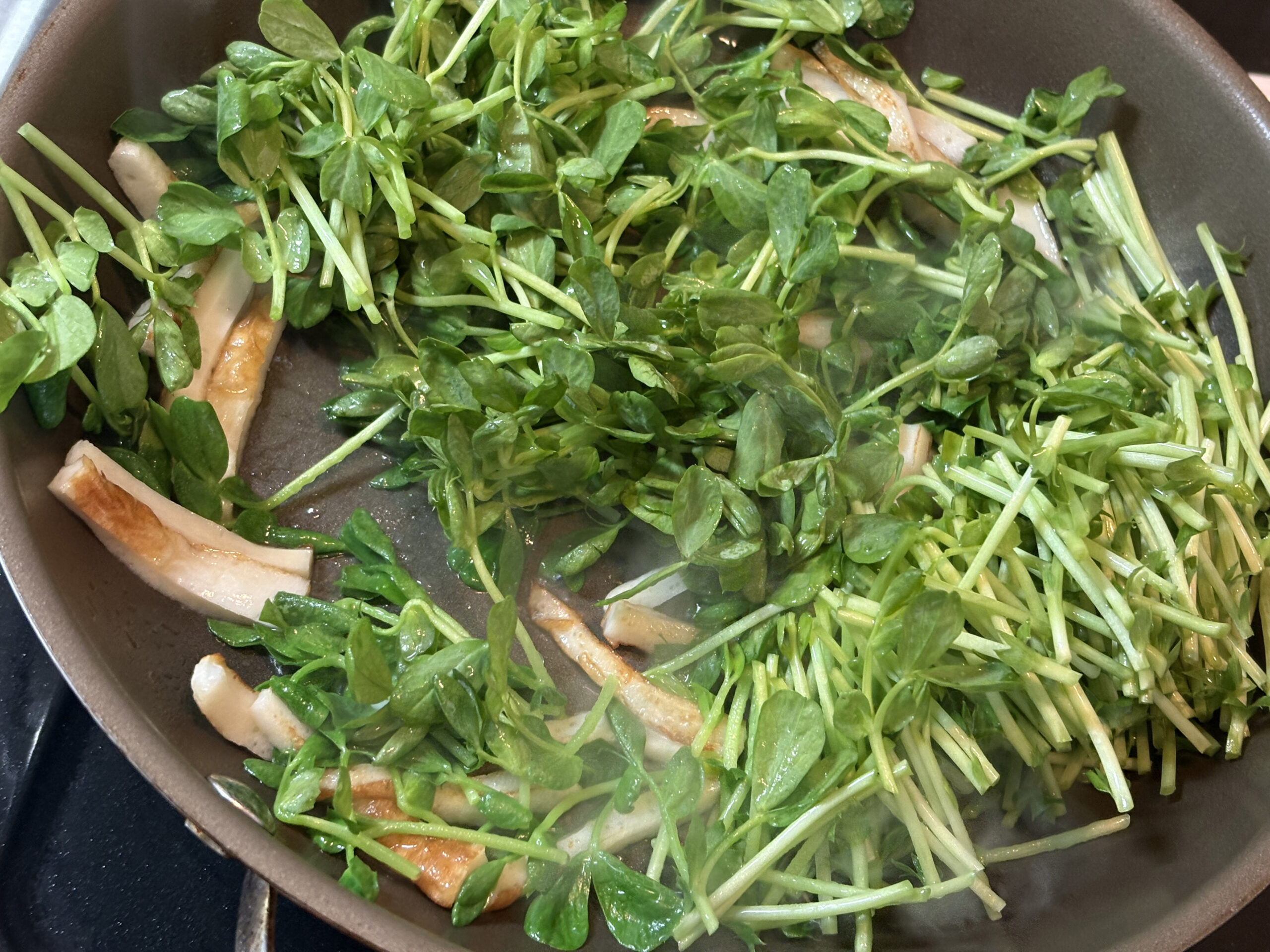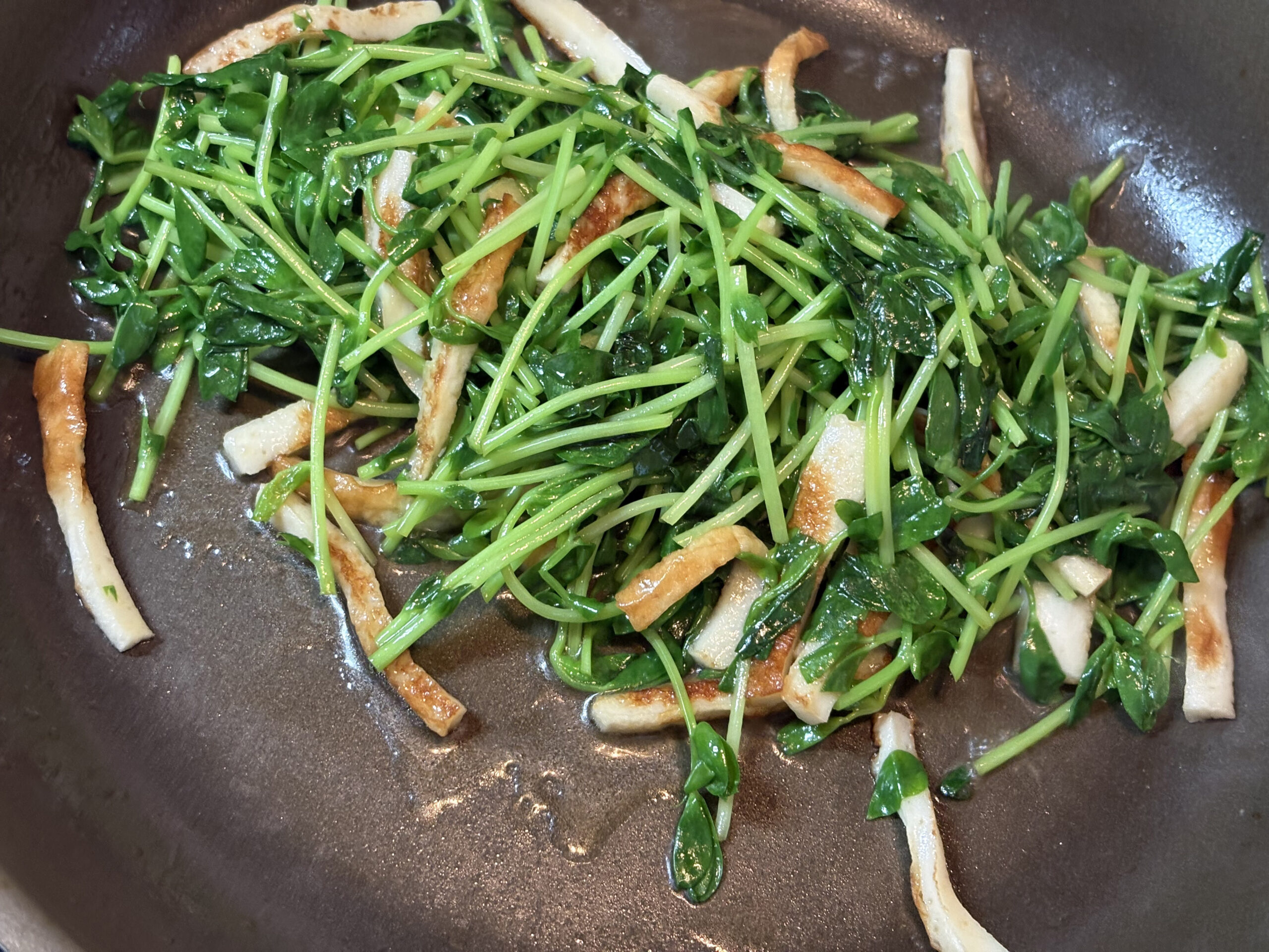 豆苗は意外と歯ごたえがしっかりしていますので、歯の悪いお年寄りに提供する場合は、あまり火力を強くせずに充分に時間を掛けて炒め柔らかくして提供しましょう。嚥下の悪い方に提供する場合は、50〜100cc程度の水を加えてめんつゆで調味し片栗粉でトロミ付けすると食べやすくなります。お年寄りの食欲の維持にはトロミ調整剤はなるべく使わないように工夫する事が大切です。