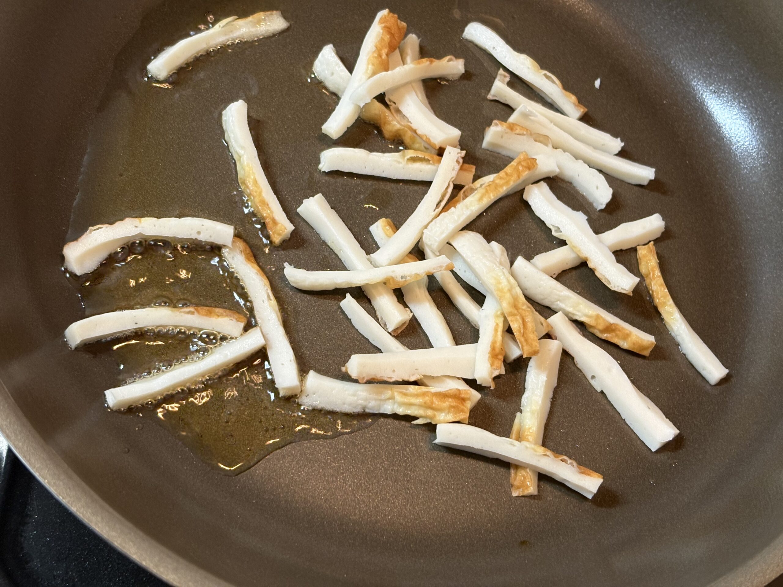 | 2 | フラパンにごま油(分量外)を熱し、1のチクワから炒めていきます。 |