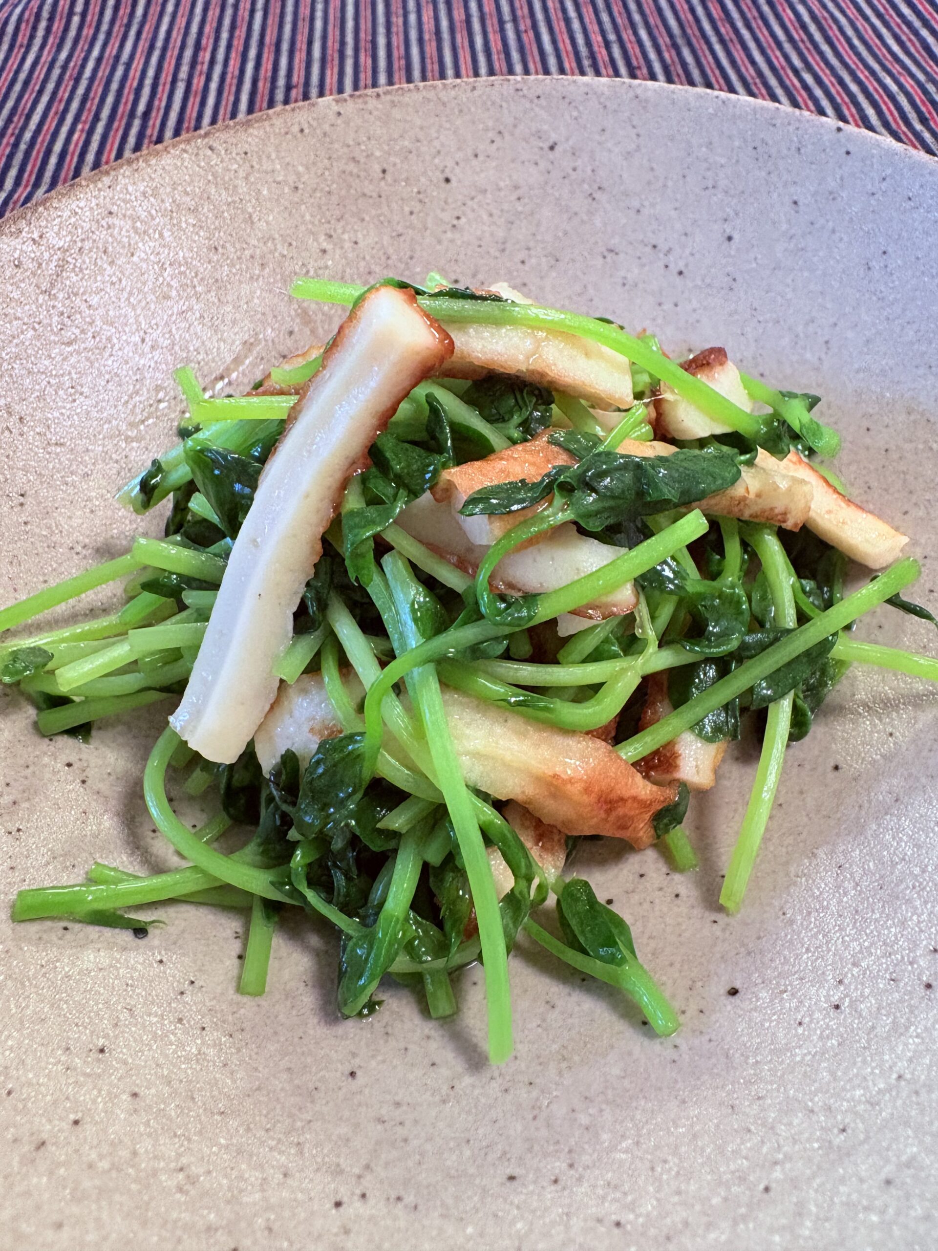 | 3 | チクワに油がまわって炒まってきたら豆苗を加え更に炒めていきます。 |