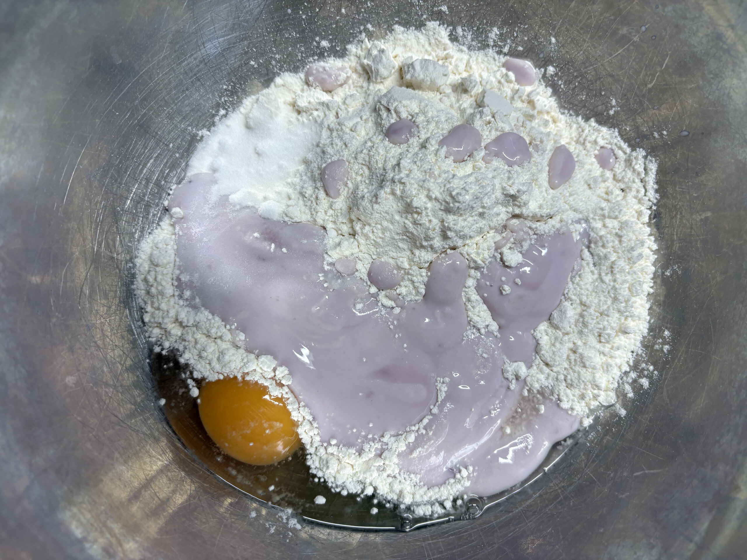 1 | 小麦粉を計ったら、分量のフルーツヨーグルトと卵、ベーキングパウダーを入れホイッパーでしっかりと混ぜて生地を作ります。 |