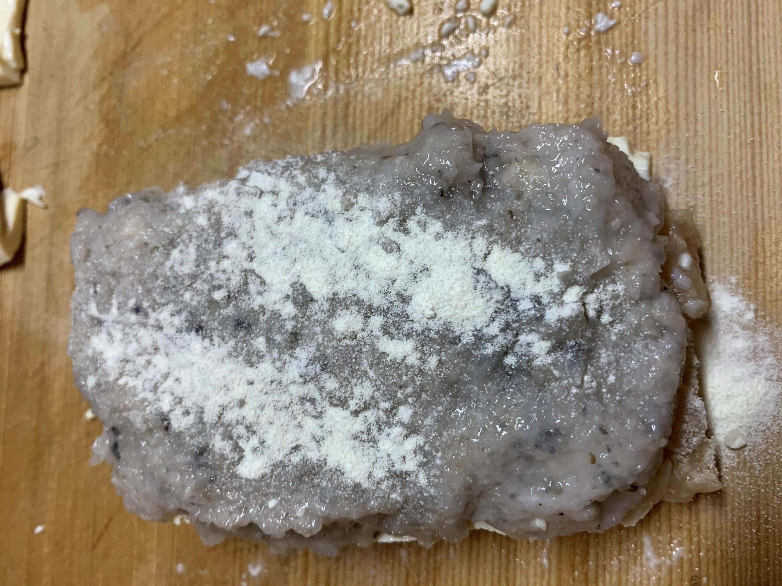 | 5 | 1の豆腐に具材をのせていきます。その際に具材をのせる面に接着剤として小麦粉(分量外)をはたいてから具材をのせていきます。 |