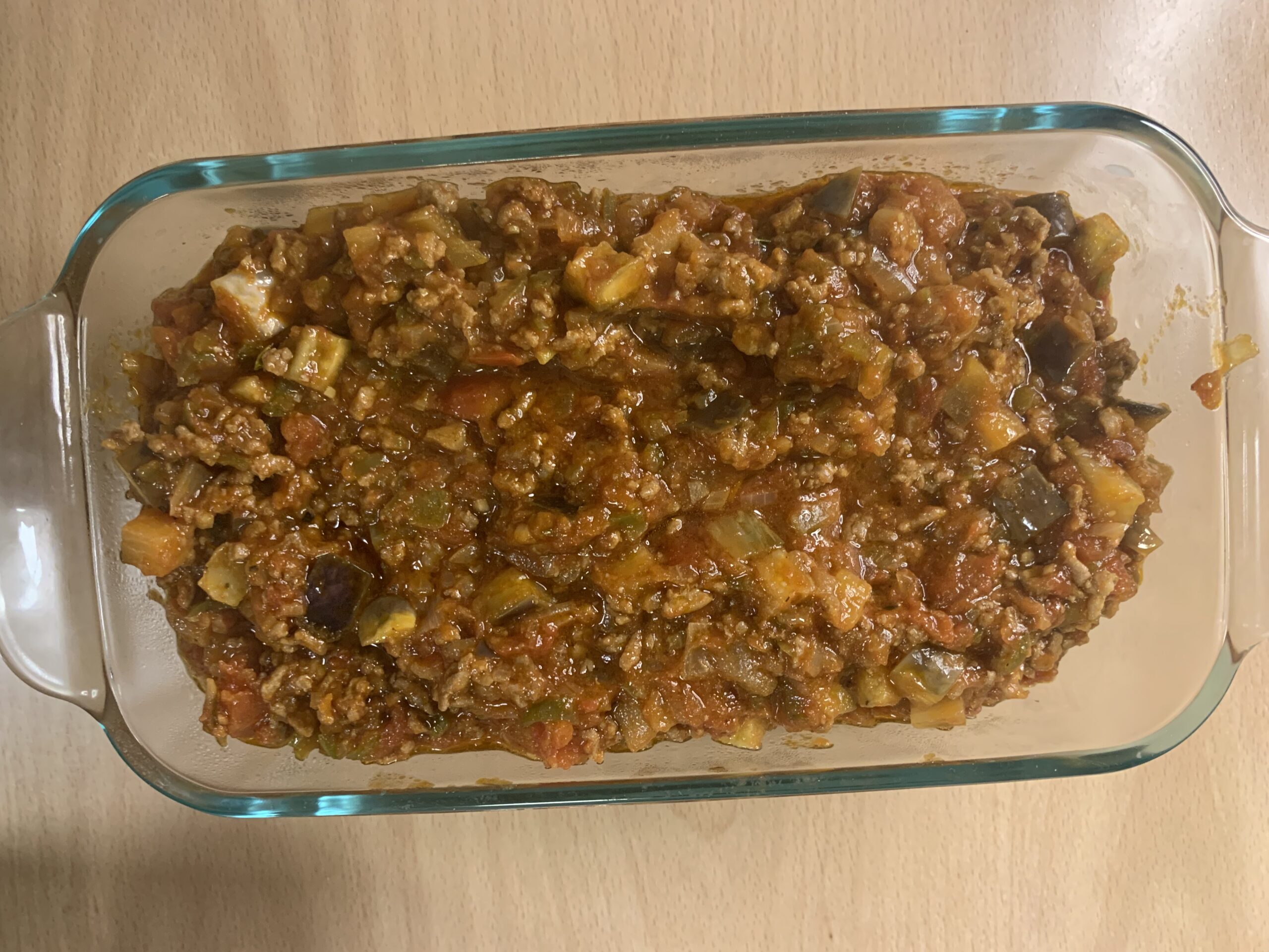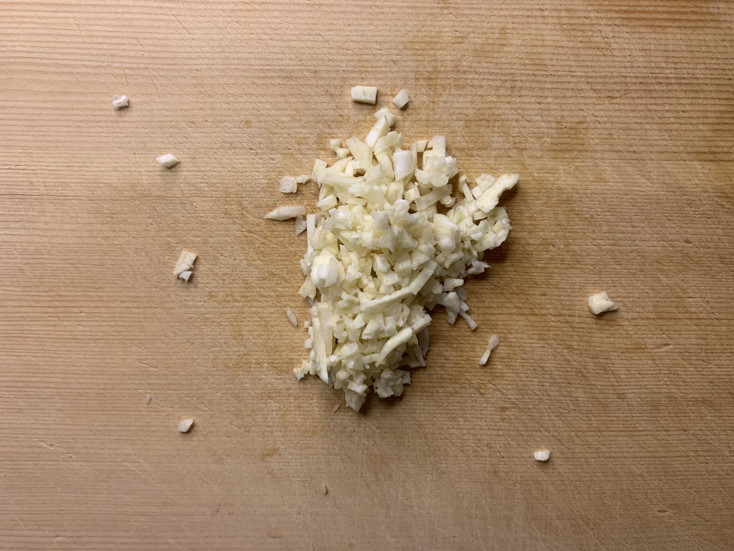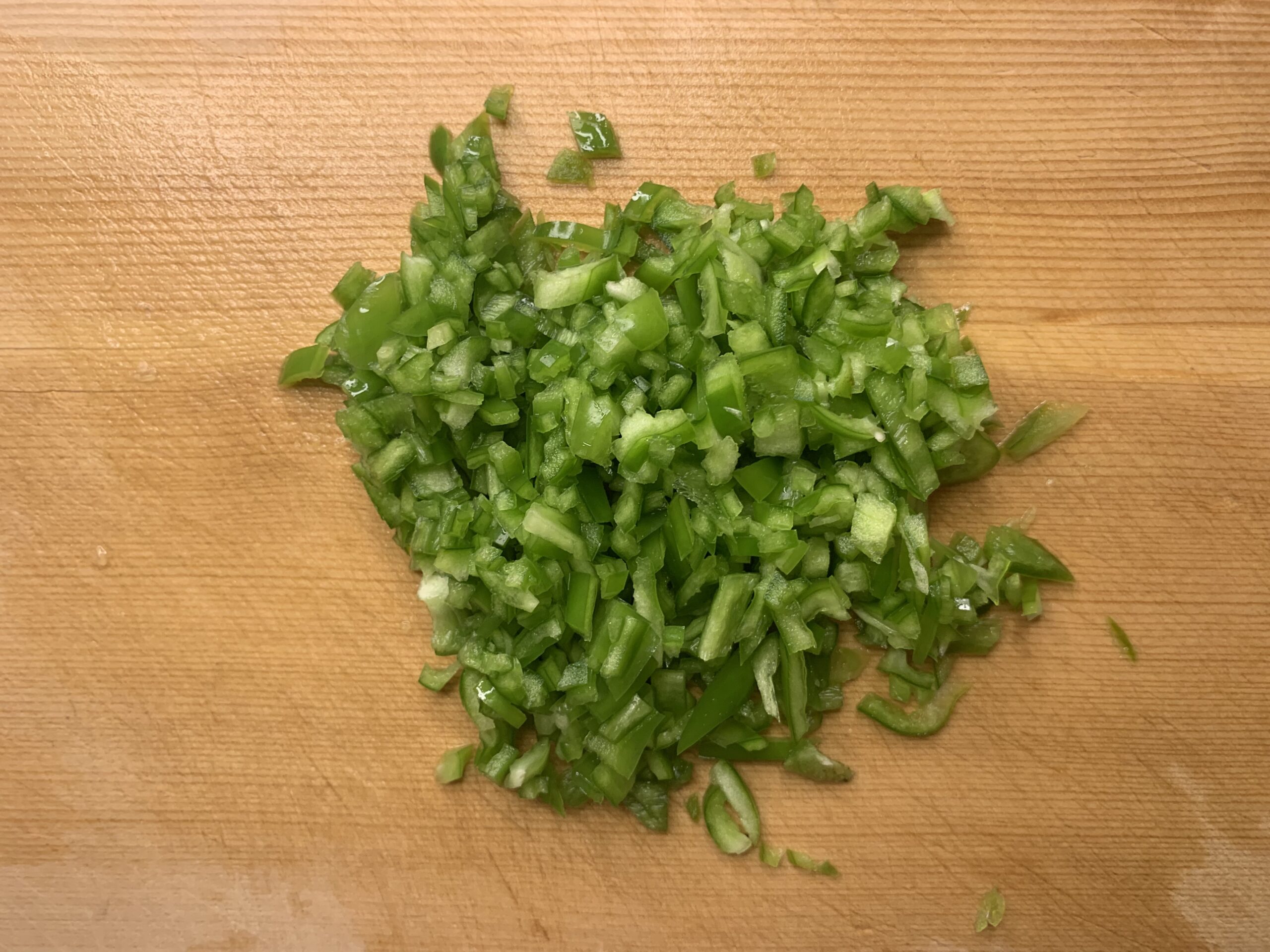 | 1 | 最初にミートソースを作っていきます。 ニンニク・玉ネギ・ピーマンはみじん切り、茄子は1センチ角くらいの角切りにしてさっと水にさらします。 |