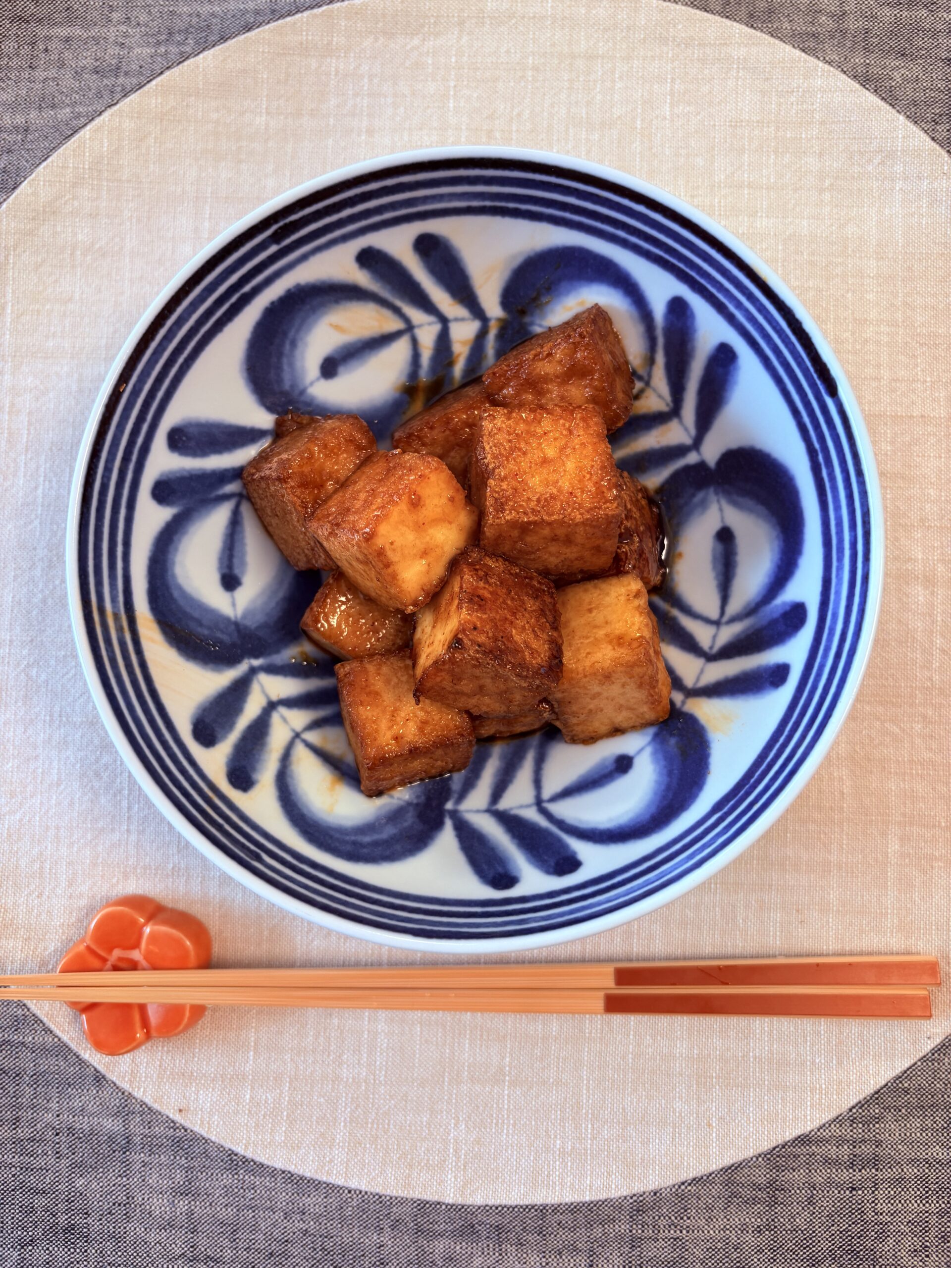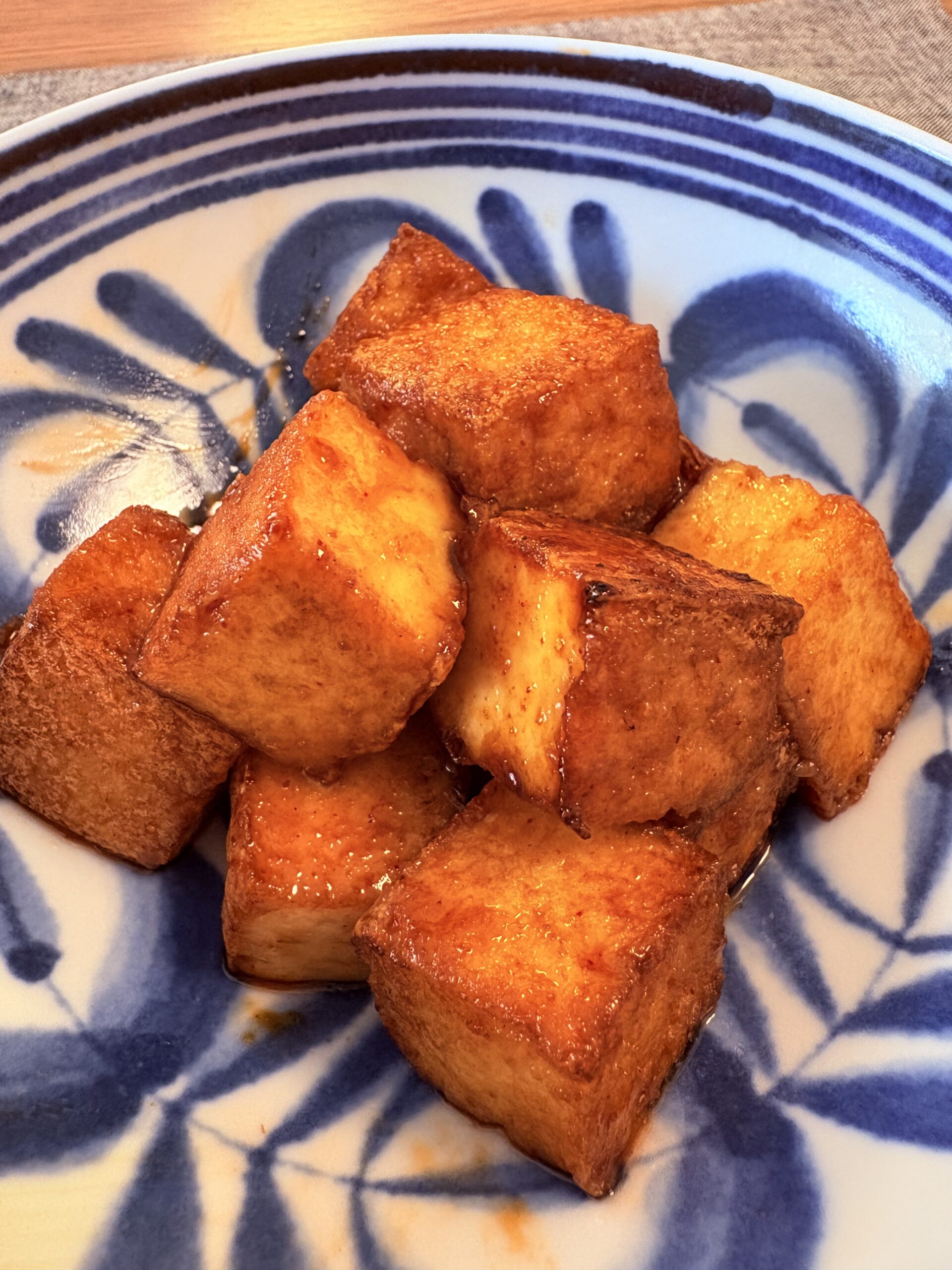 厚揚げの表面がカリッとして少し色づいてきたら2の合わせ調味料を一気に入れ、フライパンを大きく揺らしながら全体に程よい照りが付けば完成です。彩りに刻んだ青ネギなどがあれば散らすと更に良いと思います。