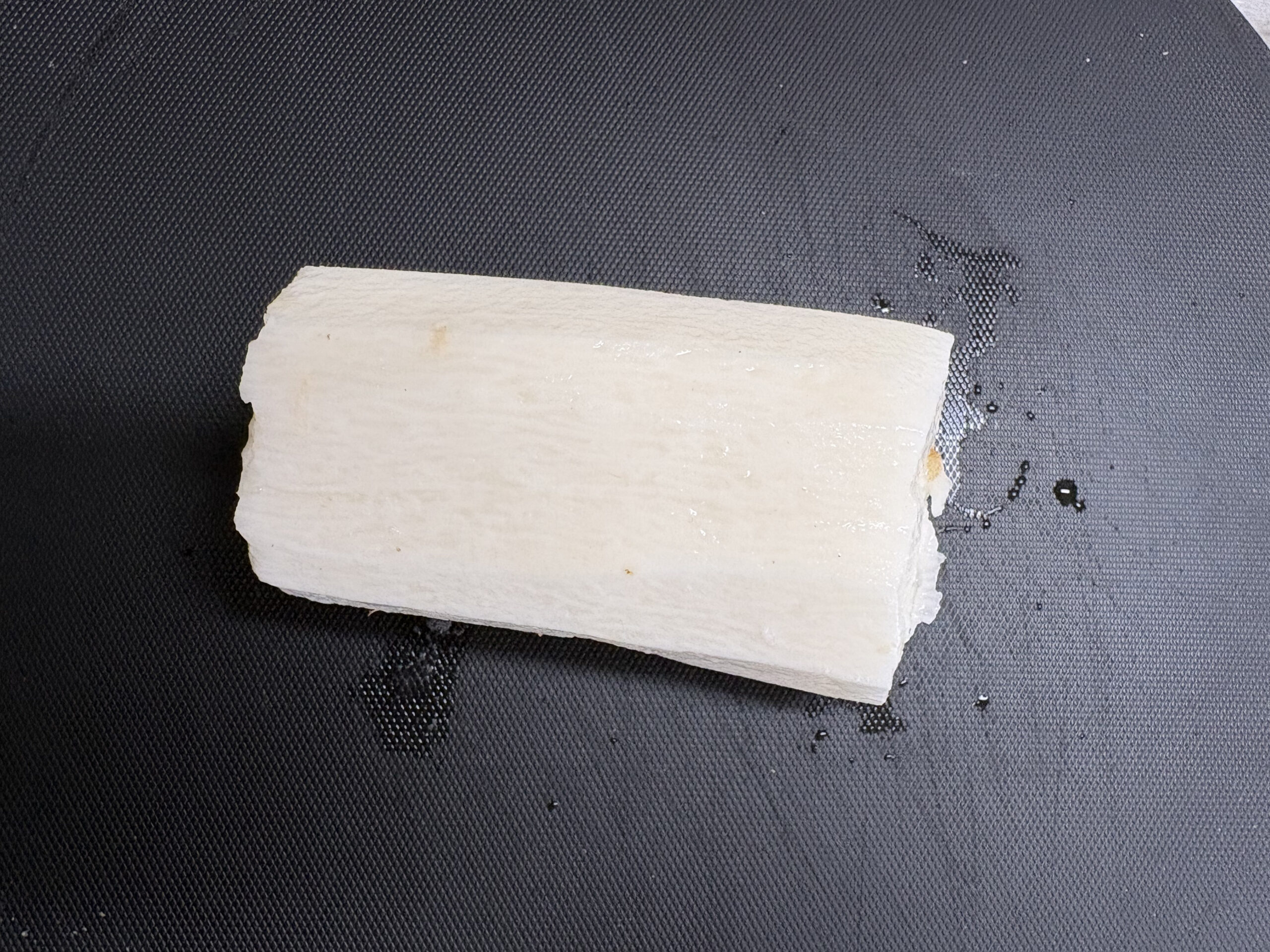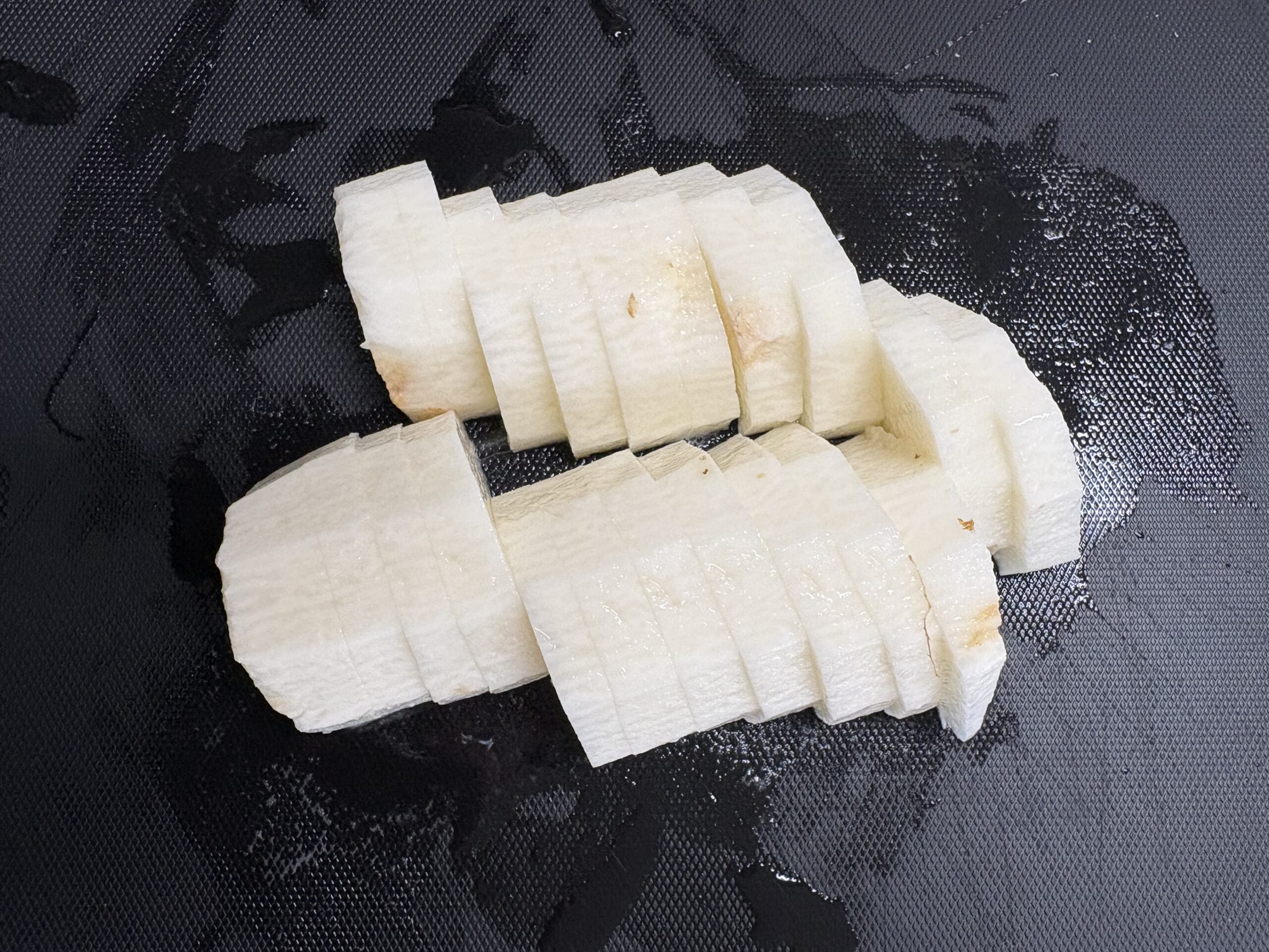 | 1 | 長芋は洗って皮を剥き、1センチ厚さくらいの食べやすい大きさで輪切りにします。芋が太い場合は縦に半割や四つ割りにしてからイチョウ切りにしましょう。 |