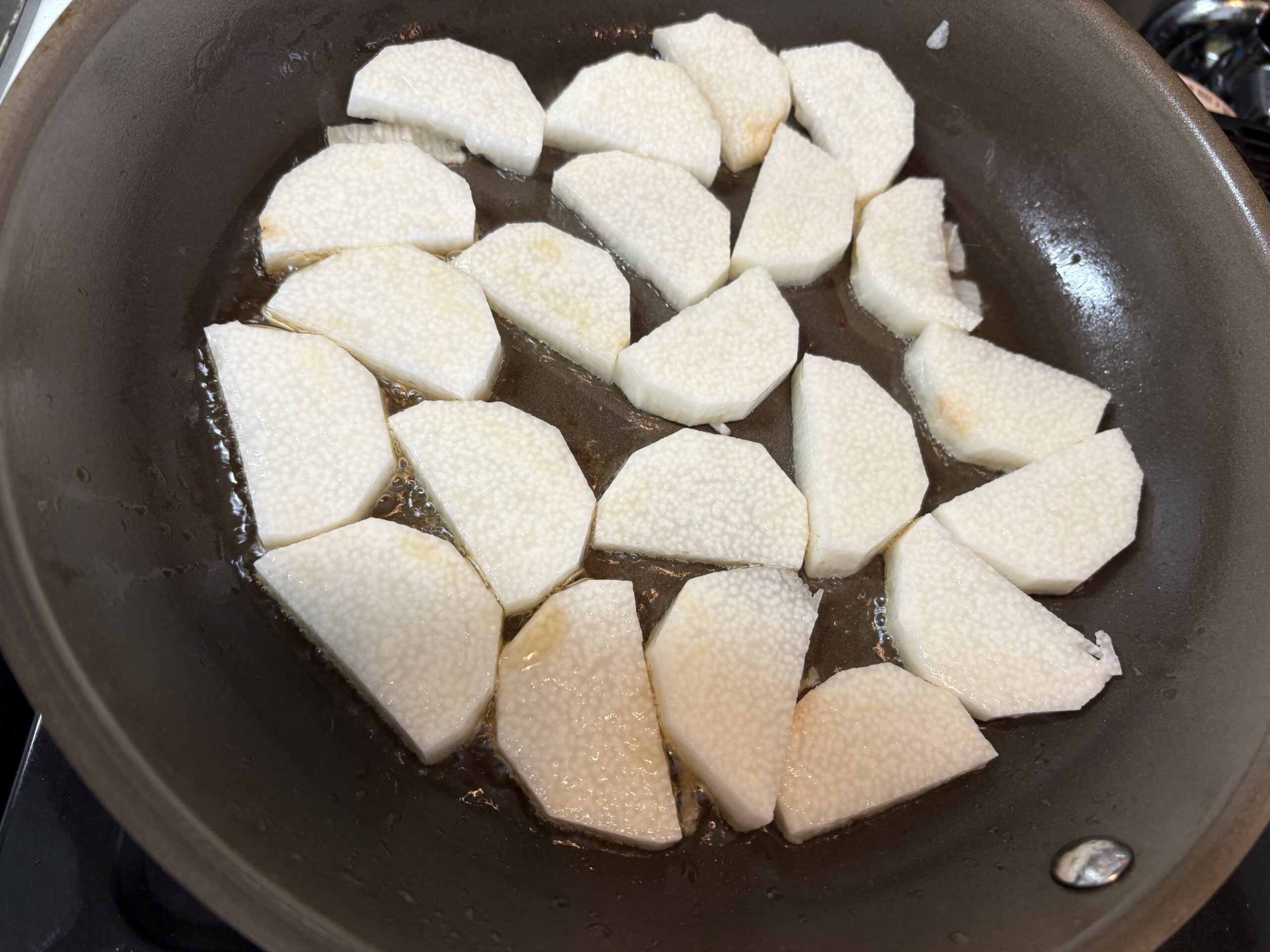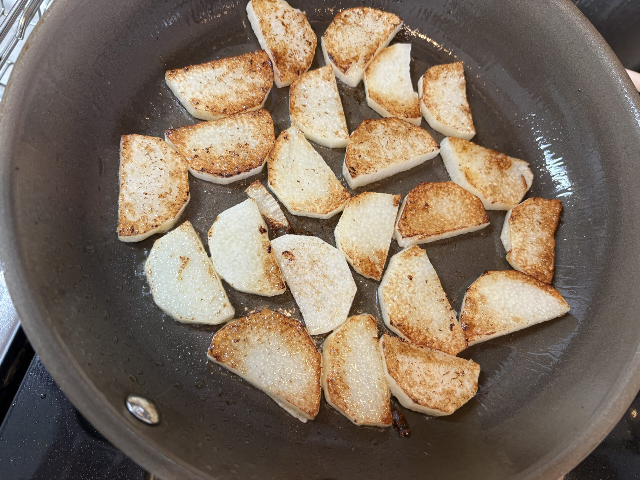 | 3 | フライパンにごま油(分量外)を熱し、1の長芋を焼いていきます。火加減は中火です。1〜2分ほど焼いたら焼いた面を確認してこんがりと焼き色が付いてきたら全て裏返して更に焼きます。 |