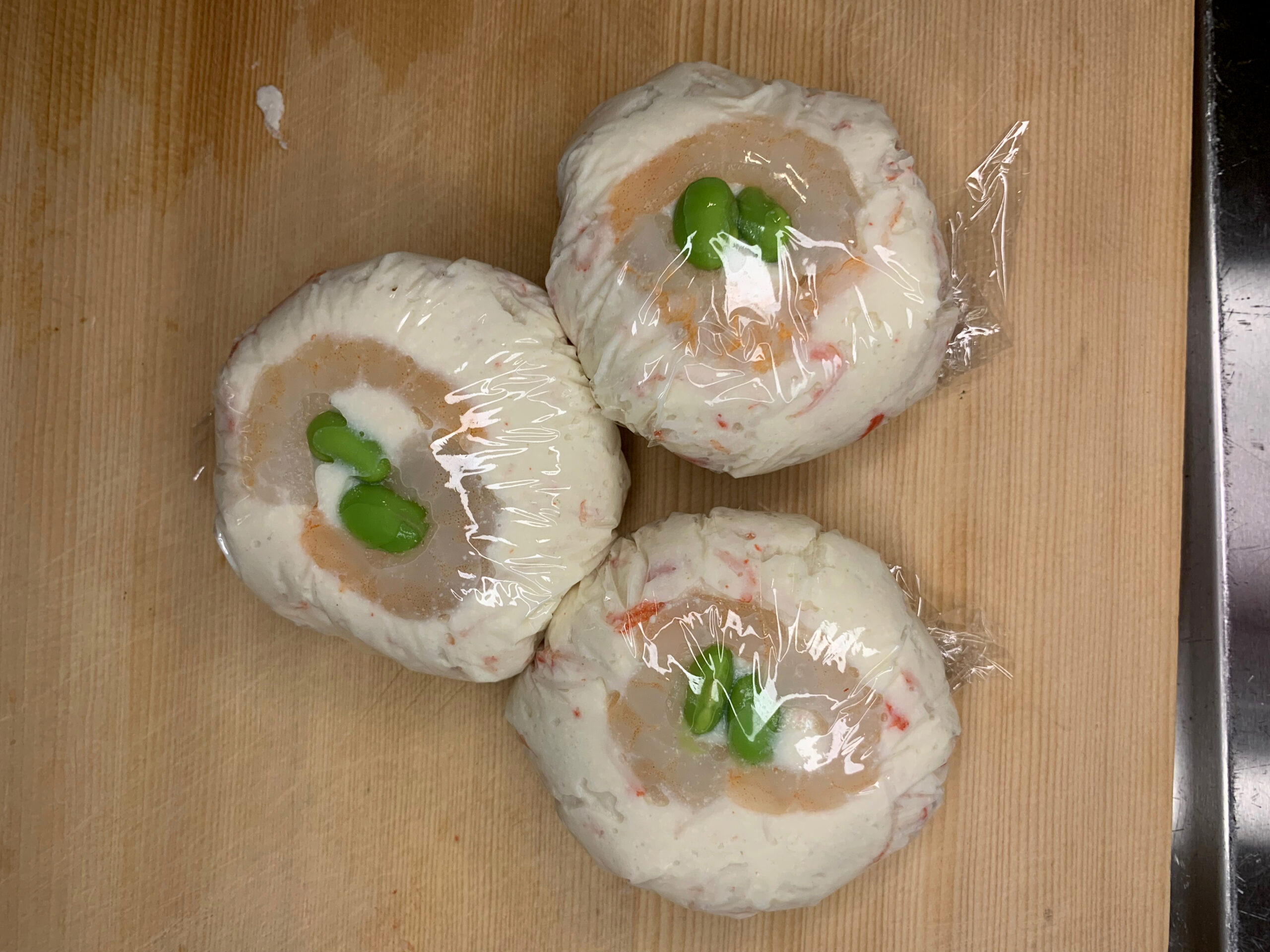 | 4 | お椀などの丸い器にラップを敷き、むきエビと枝豆を入れます。 |
