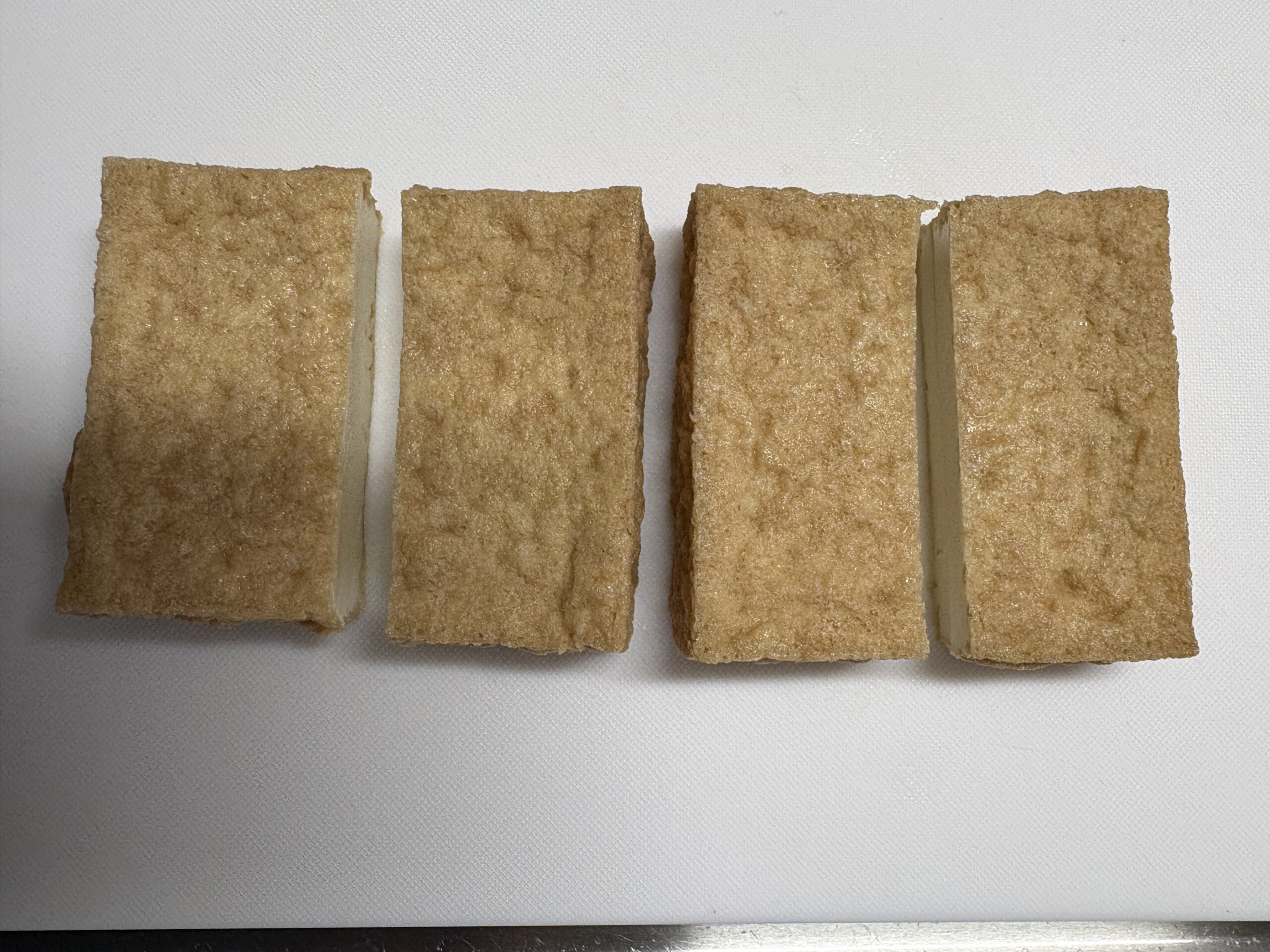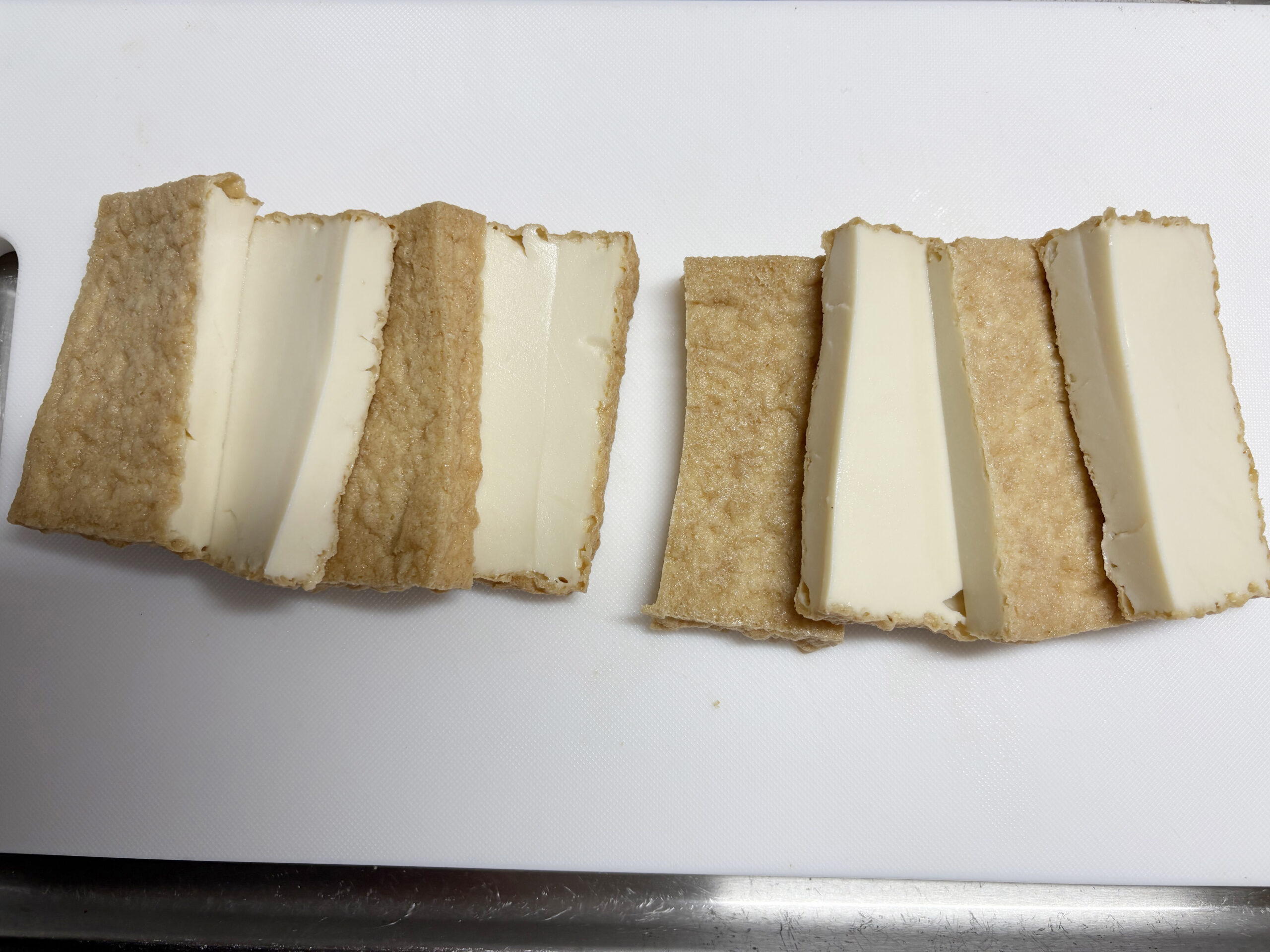 1 | 厚揚げは長さと厚みを半分に切りそろえます。 |