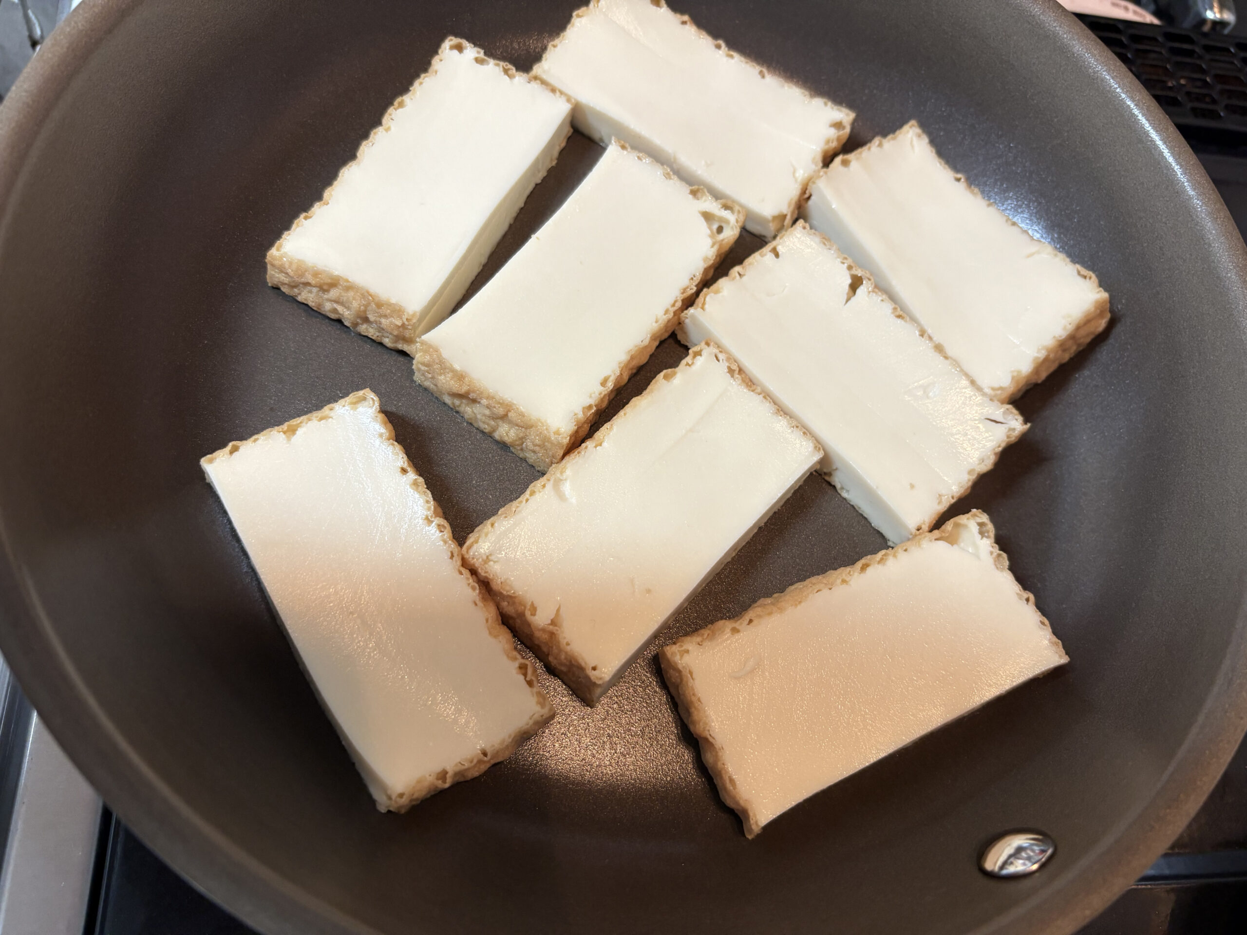 2 | フライパンを弱めの中火で熱し、1の厚揚げを外側の面を下にして焼いていきます。油は必要ありません。 |