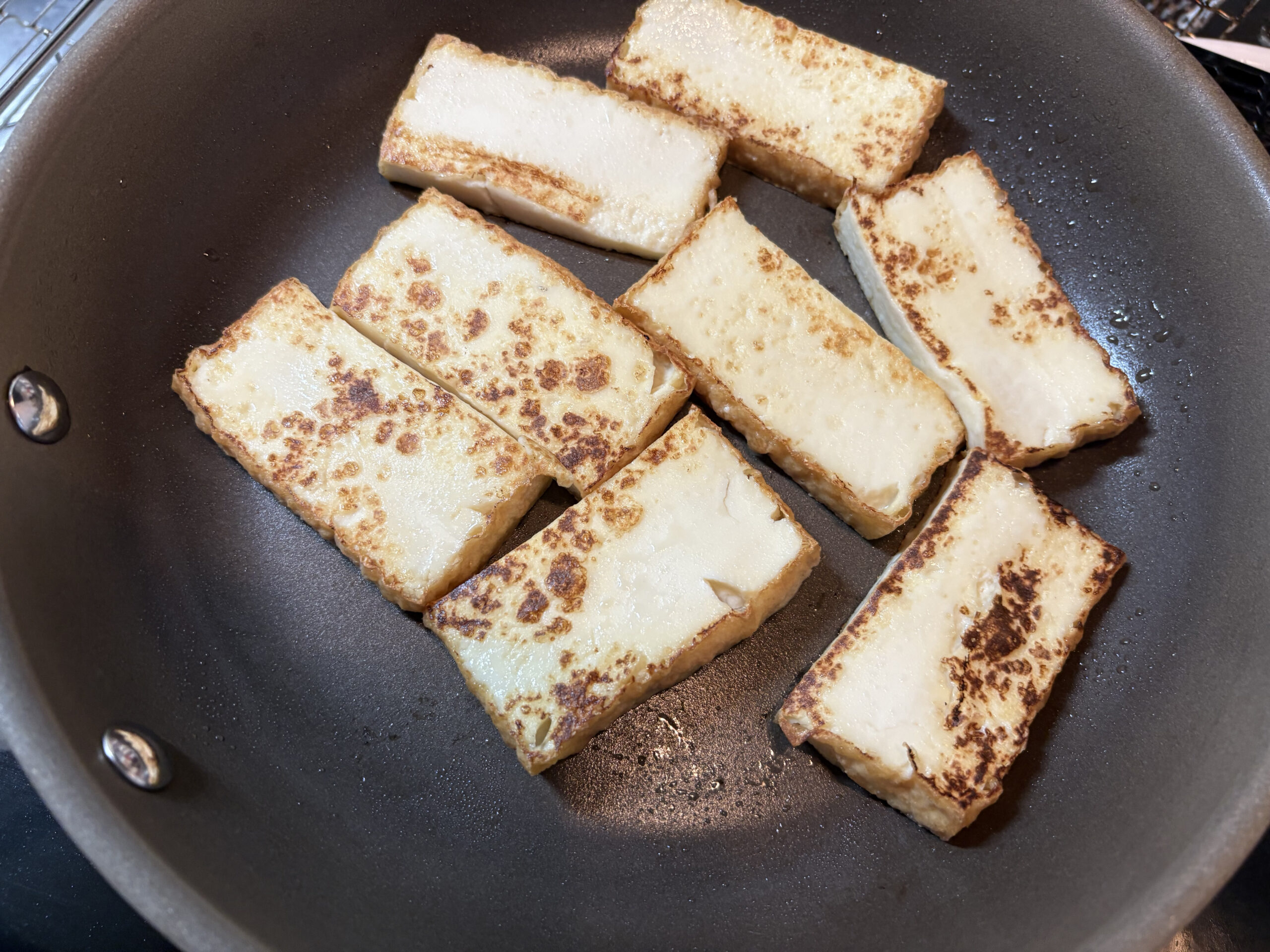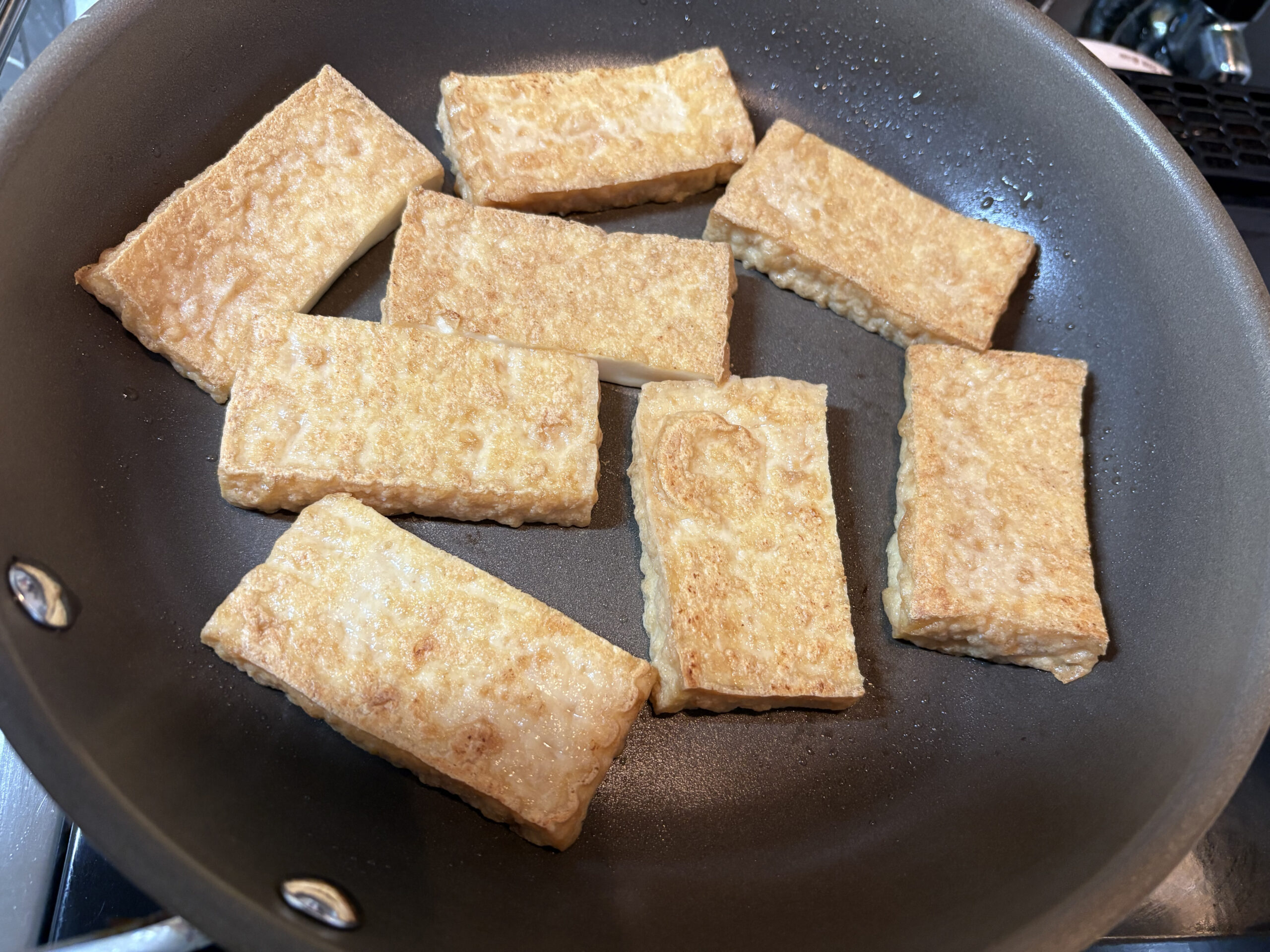 トロミの付いた餡かけレシピは嚥下の悪い方にはおすすめですから、基本の餡の作り方だけ覚えておくと色々応用も出来ますし便利だと思います。厚揚げを今回はフライパンで焼いていますが、簡単にトースターで焼いてしまってもかまいません。その場合、油が落ちますからトースター用のトレイに乗せて焼くか、アルミホイルなどを使って焼きましょう。