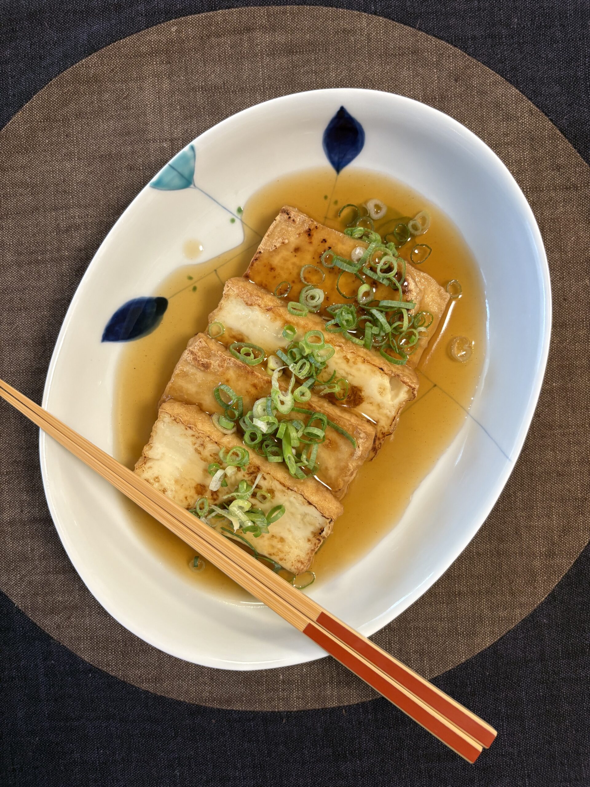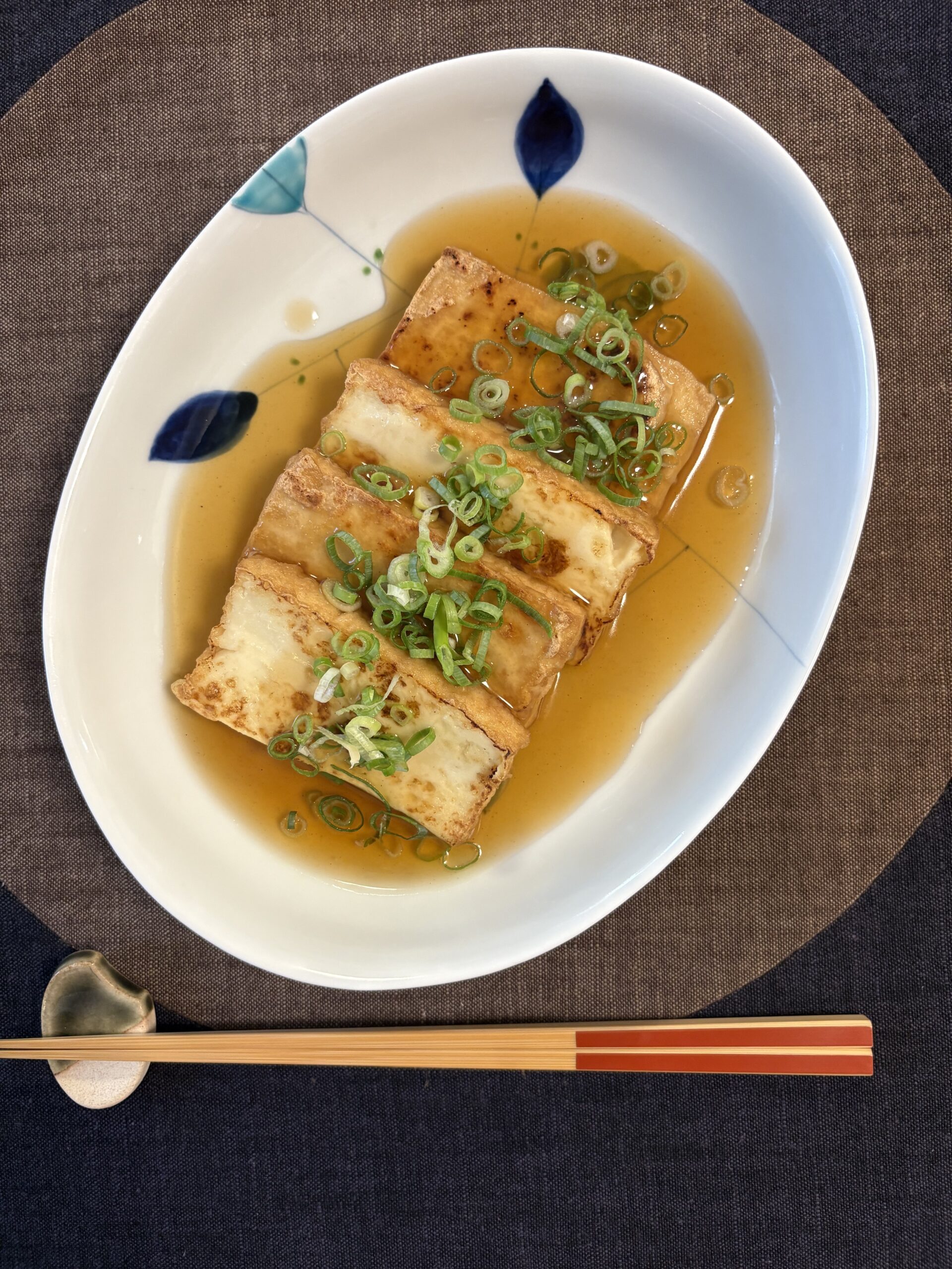 5 | 4の厚揚げを器に盛り付け、3の餡を掛けたら彩りに刻みネギなどが有れば散らして完成です。お好みでおろし生姜も付けると更に美味しいと思います。 |